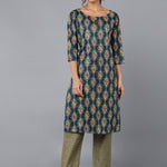 Cotton Blend Printed Straight Kurta Set (Teal Blue)