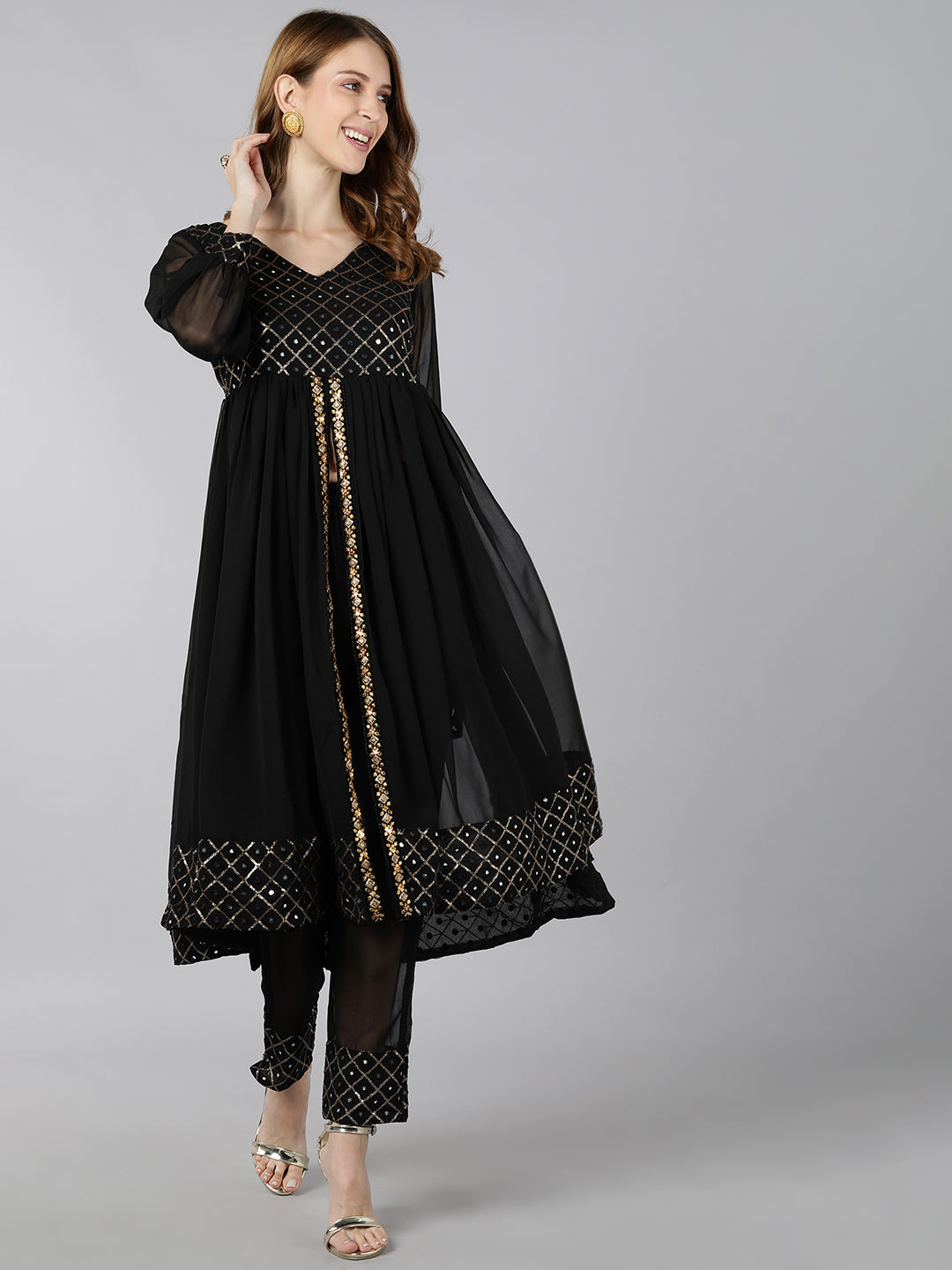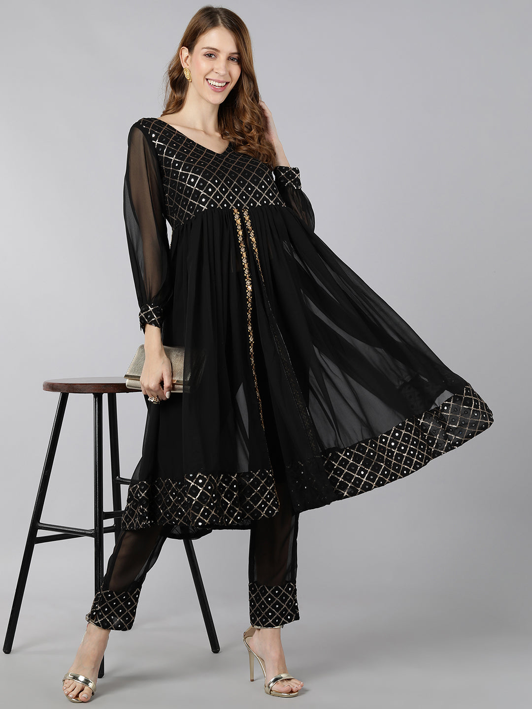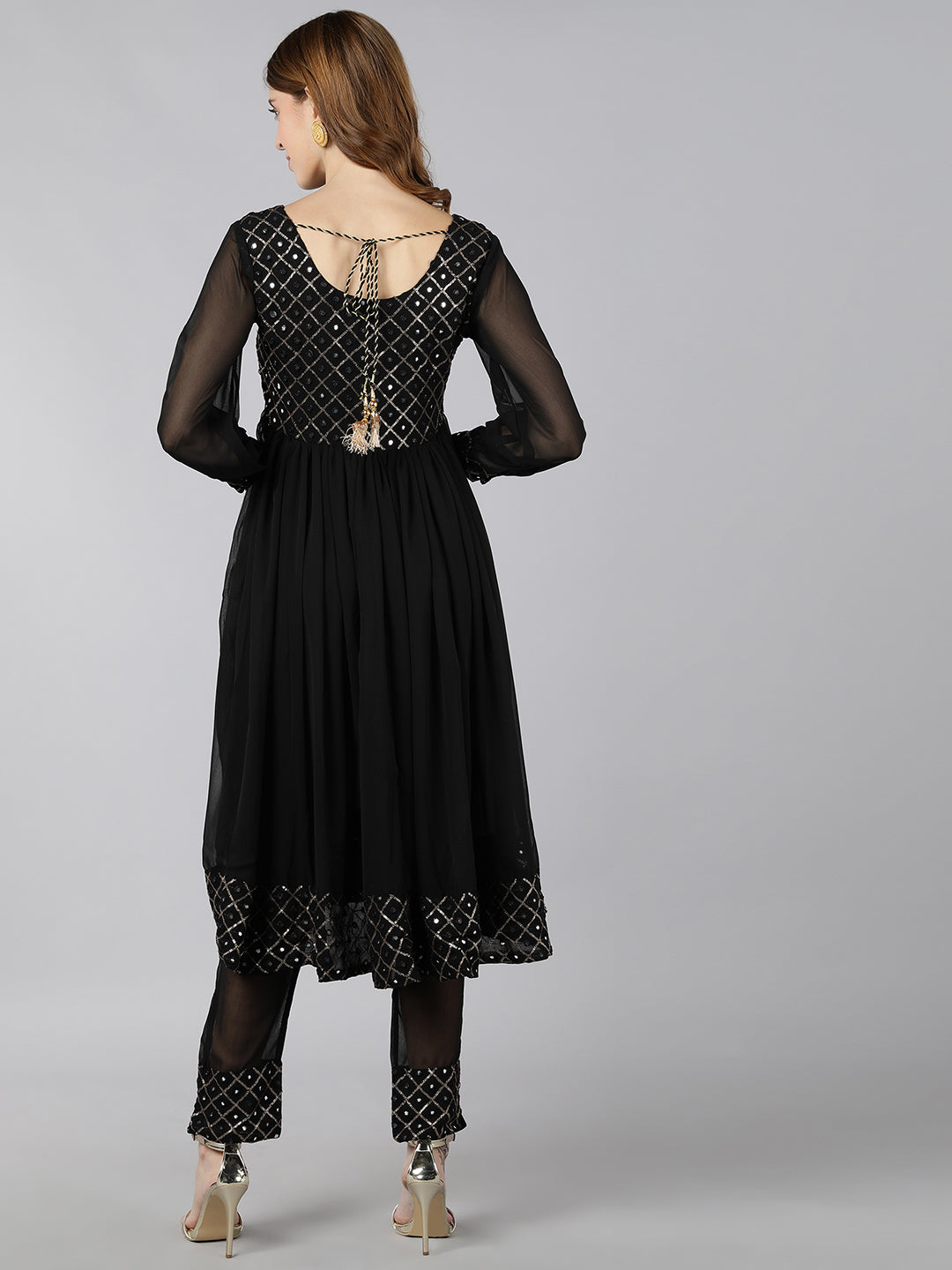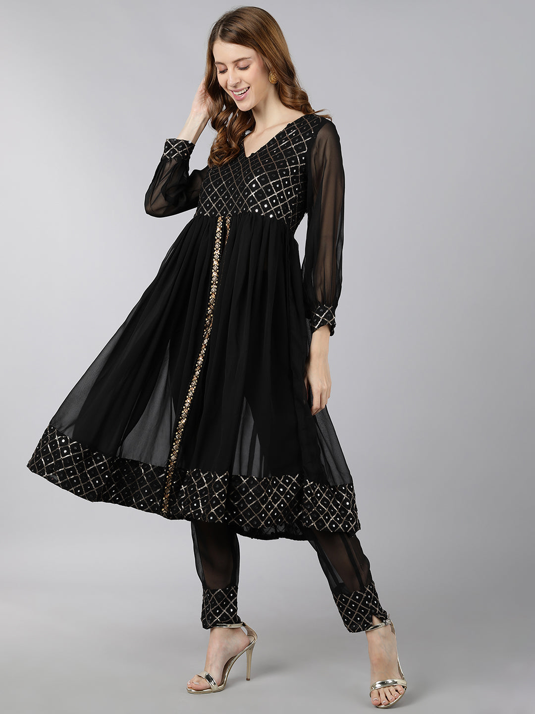 Closure - Mirror Work, Sheer Kurta And Pant, Puffed Sleeves, Design On Yoke And Pant