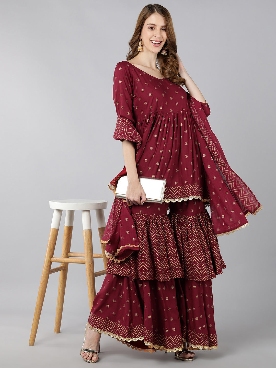 Rayon Gold Print Flared Ethnic Set (Maroon)