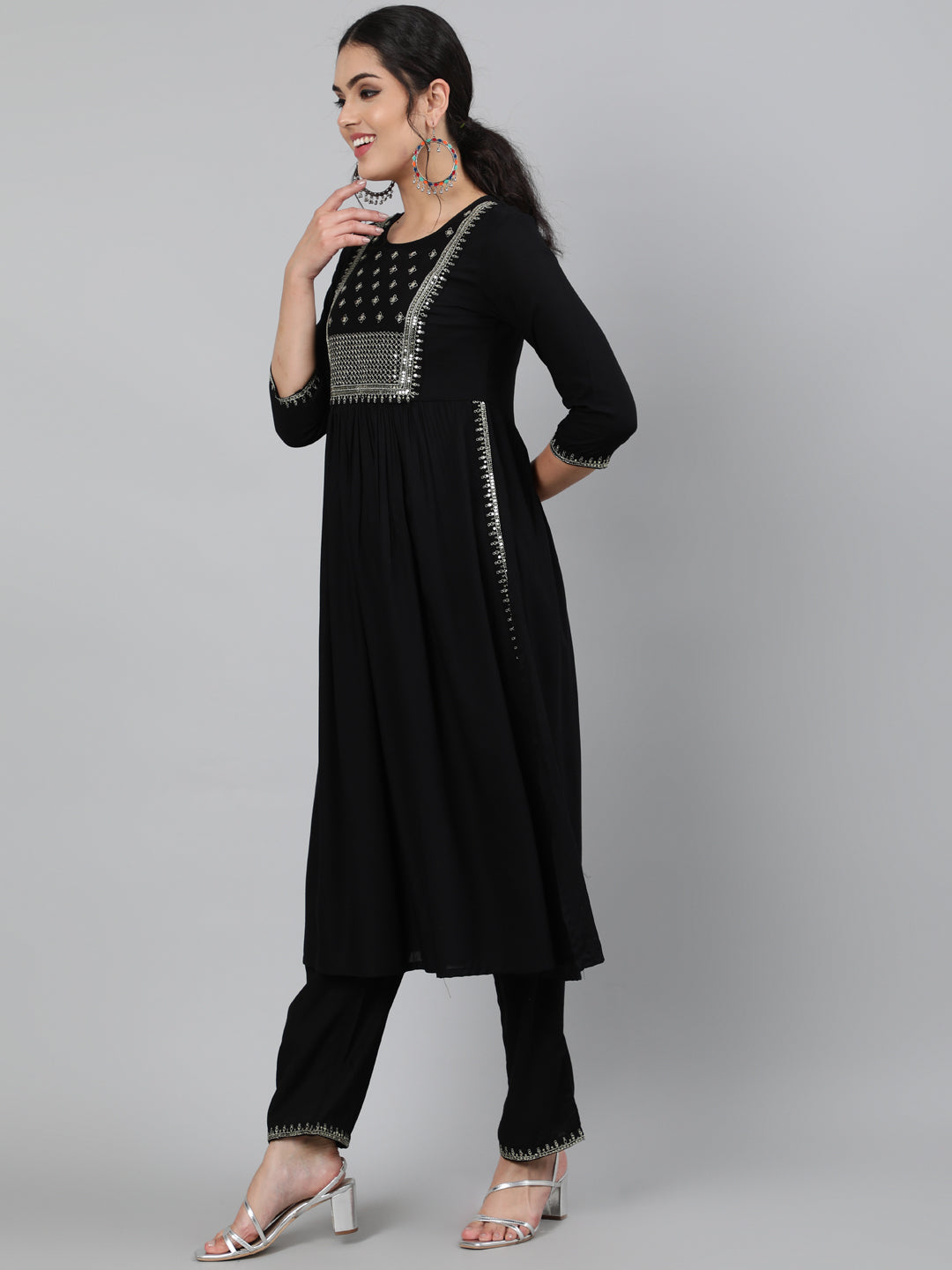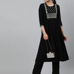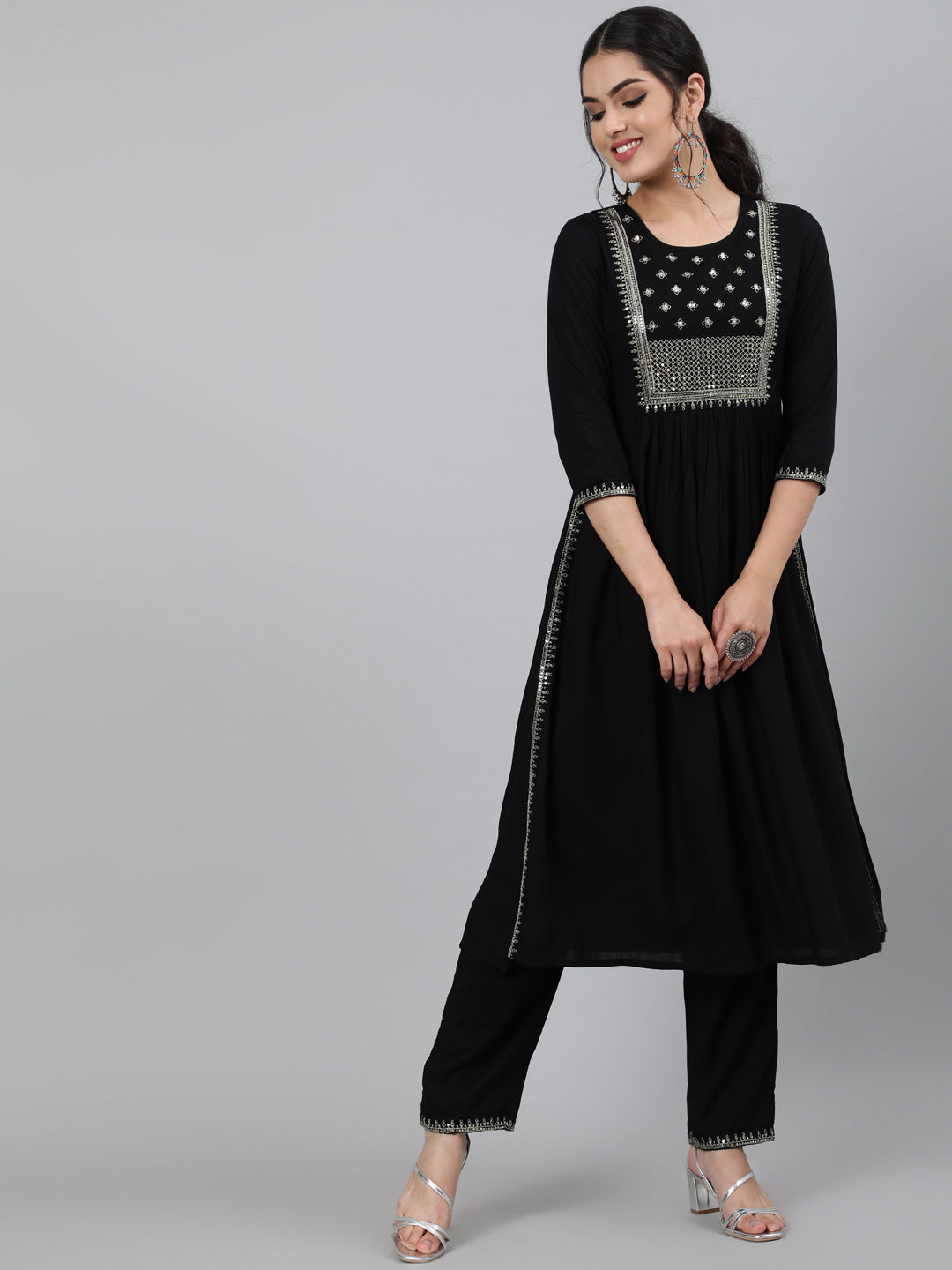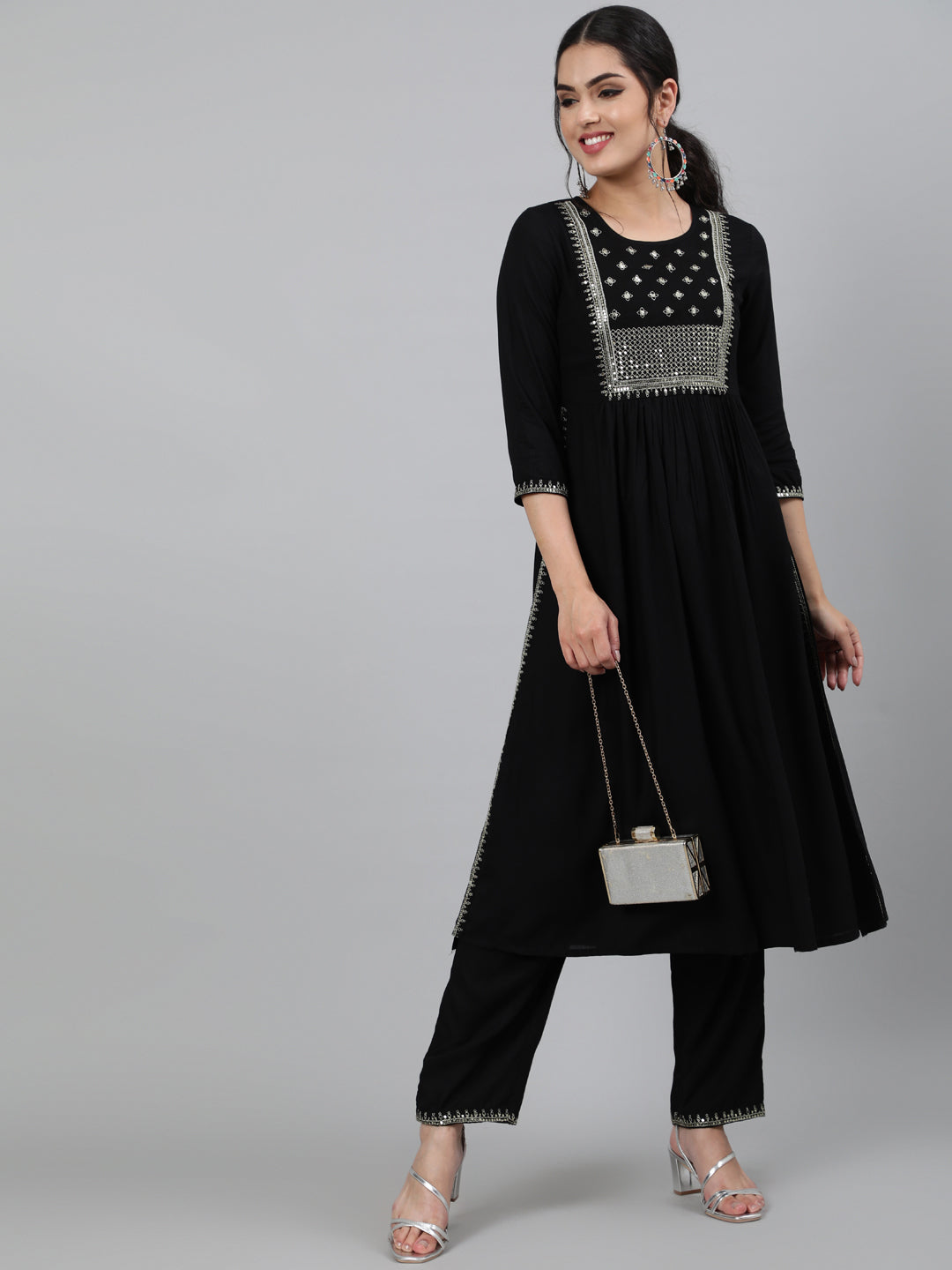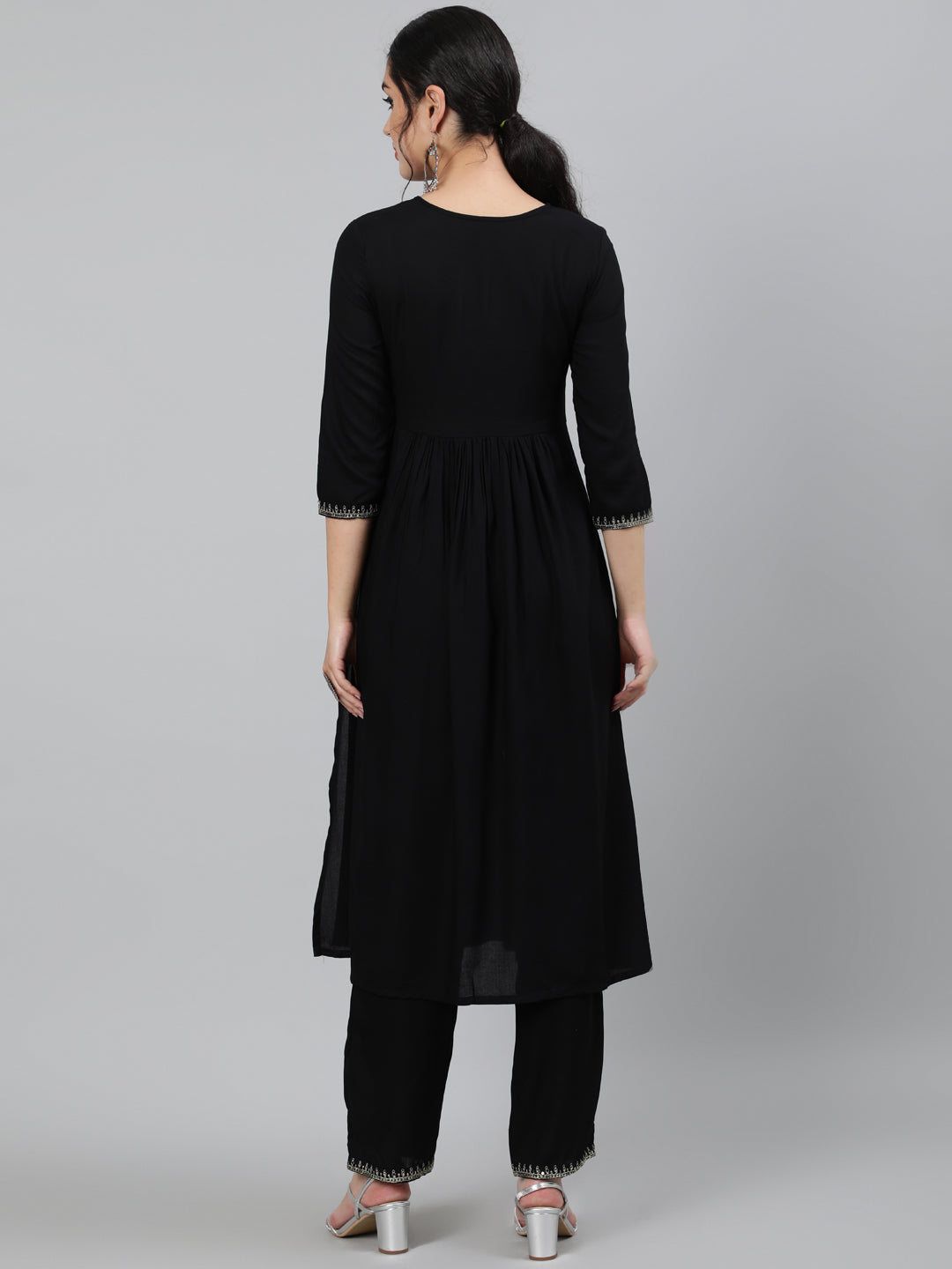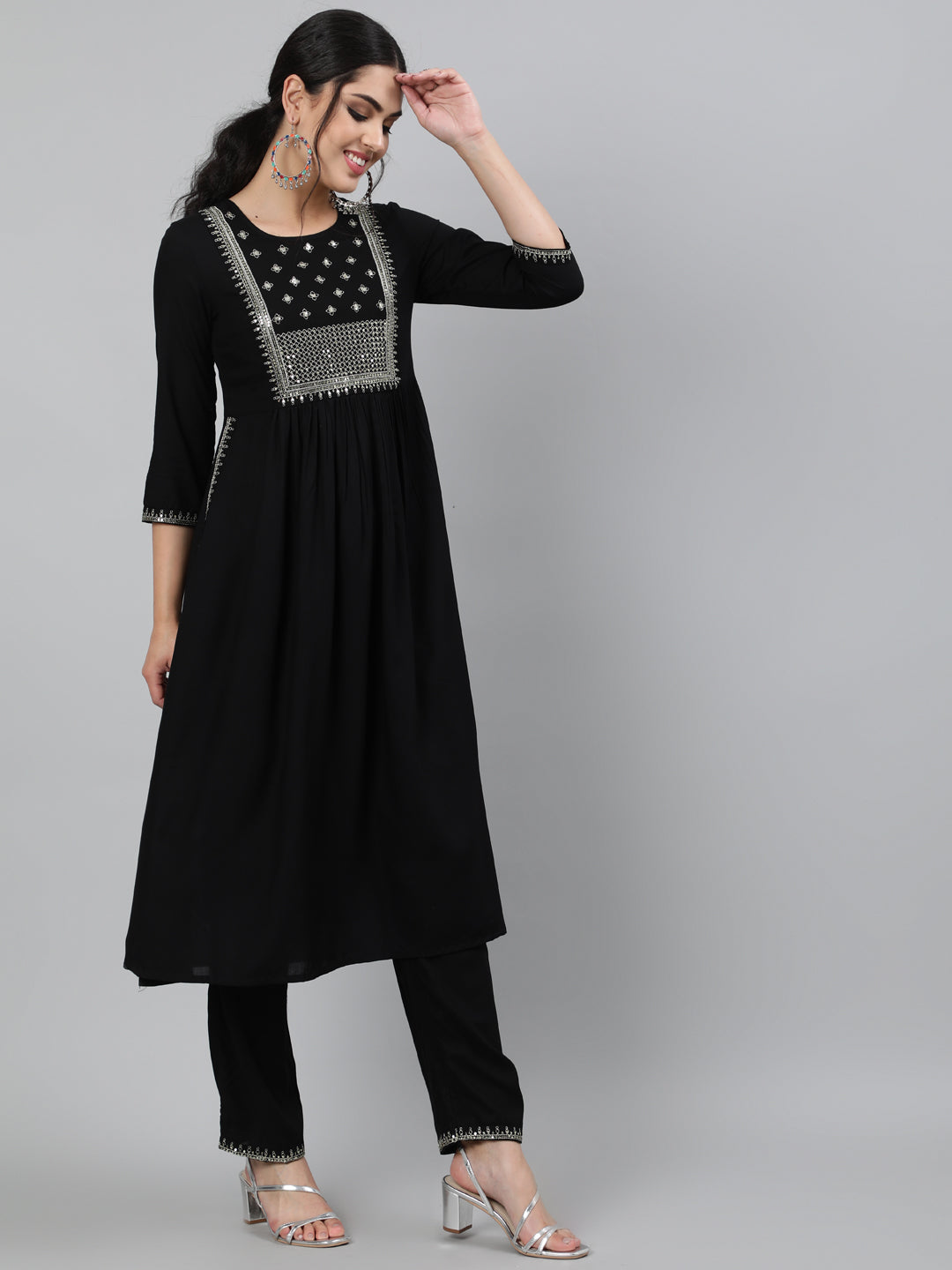 Women Rayon Slub Round Neck 3/4 Sleeve Solid A-Line Kurta & Pant Set