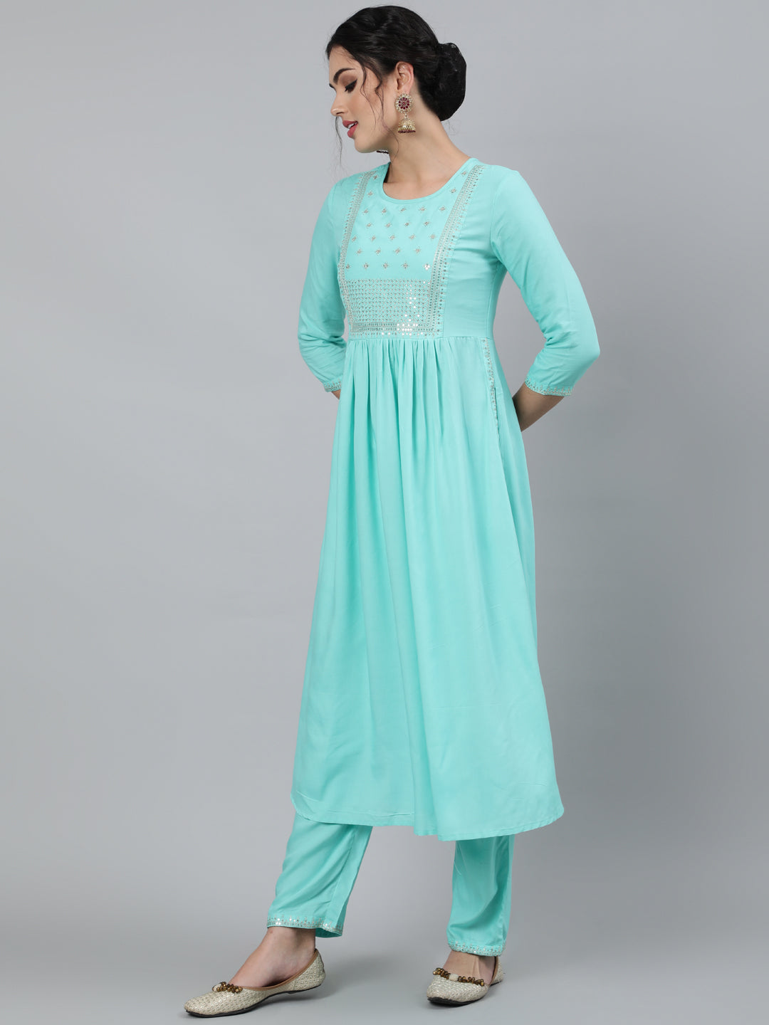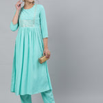 Women Rayon Slub Round Neck 3/4 Sleeve Solid A-Line Kurta & Pant Set