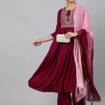 Women Rayon Round Neck 3/4 Sleeve Embroidered Flared Kurta, Palazzo & Chiffon Tie-Dye Dupatta Set