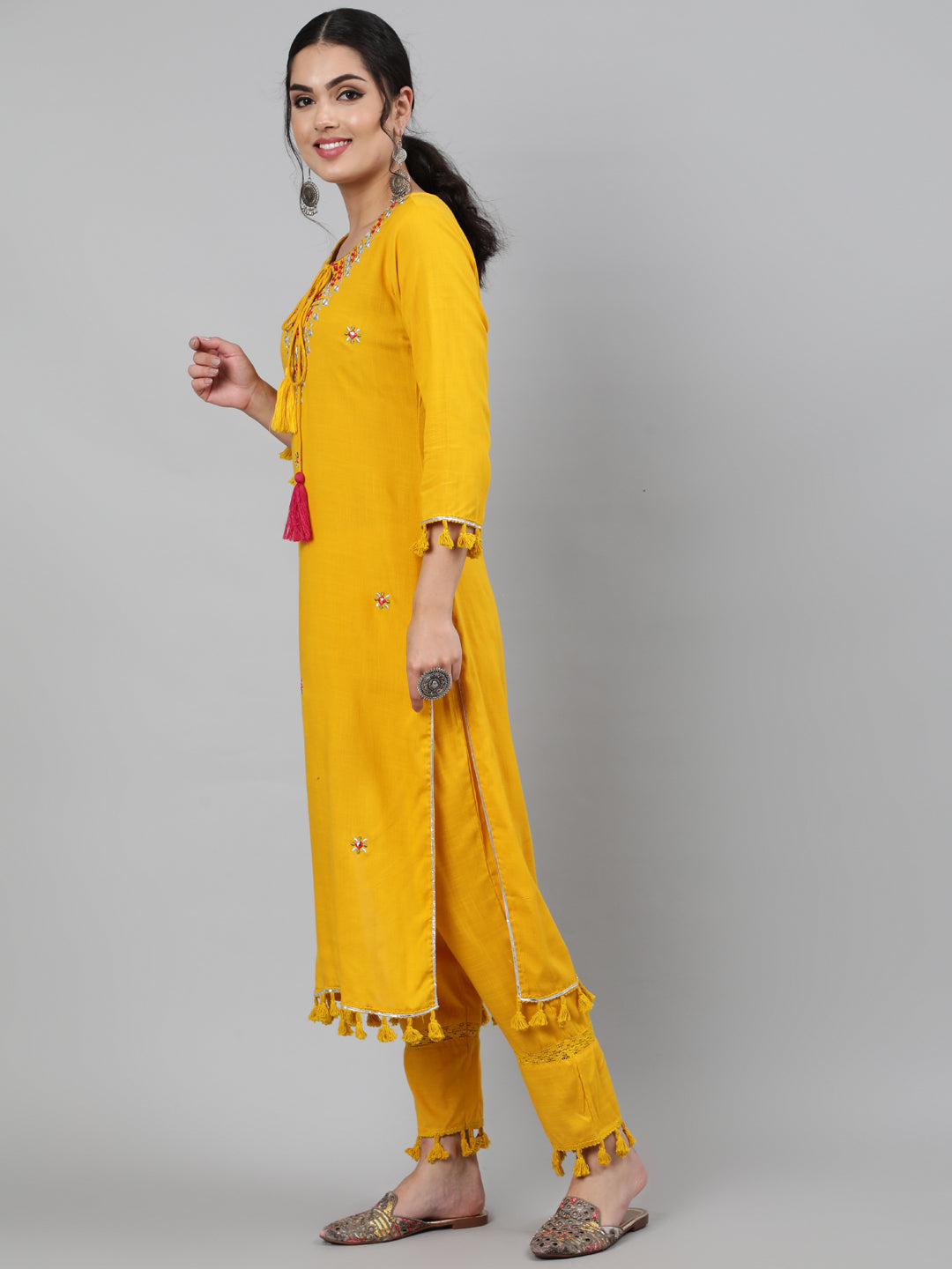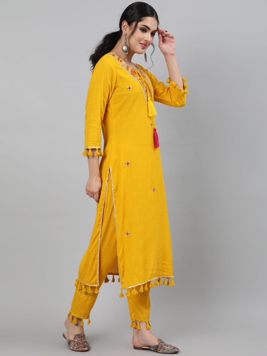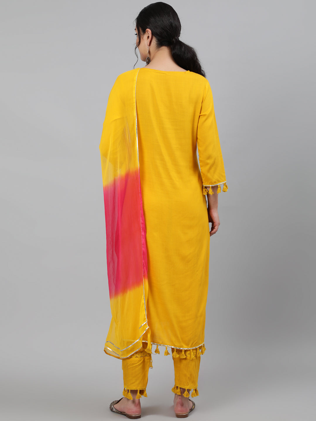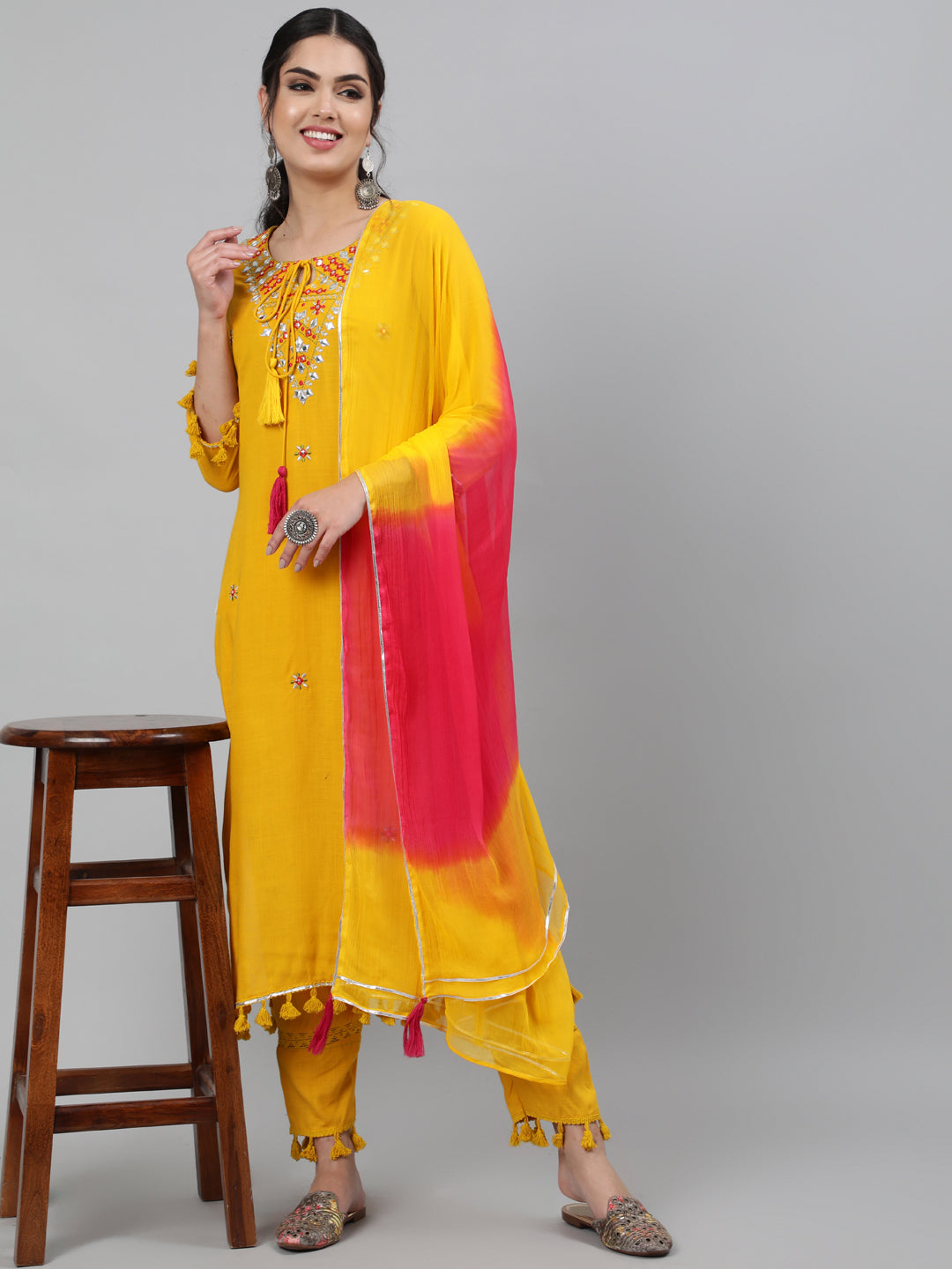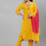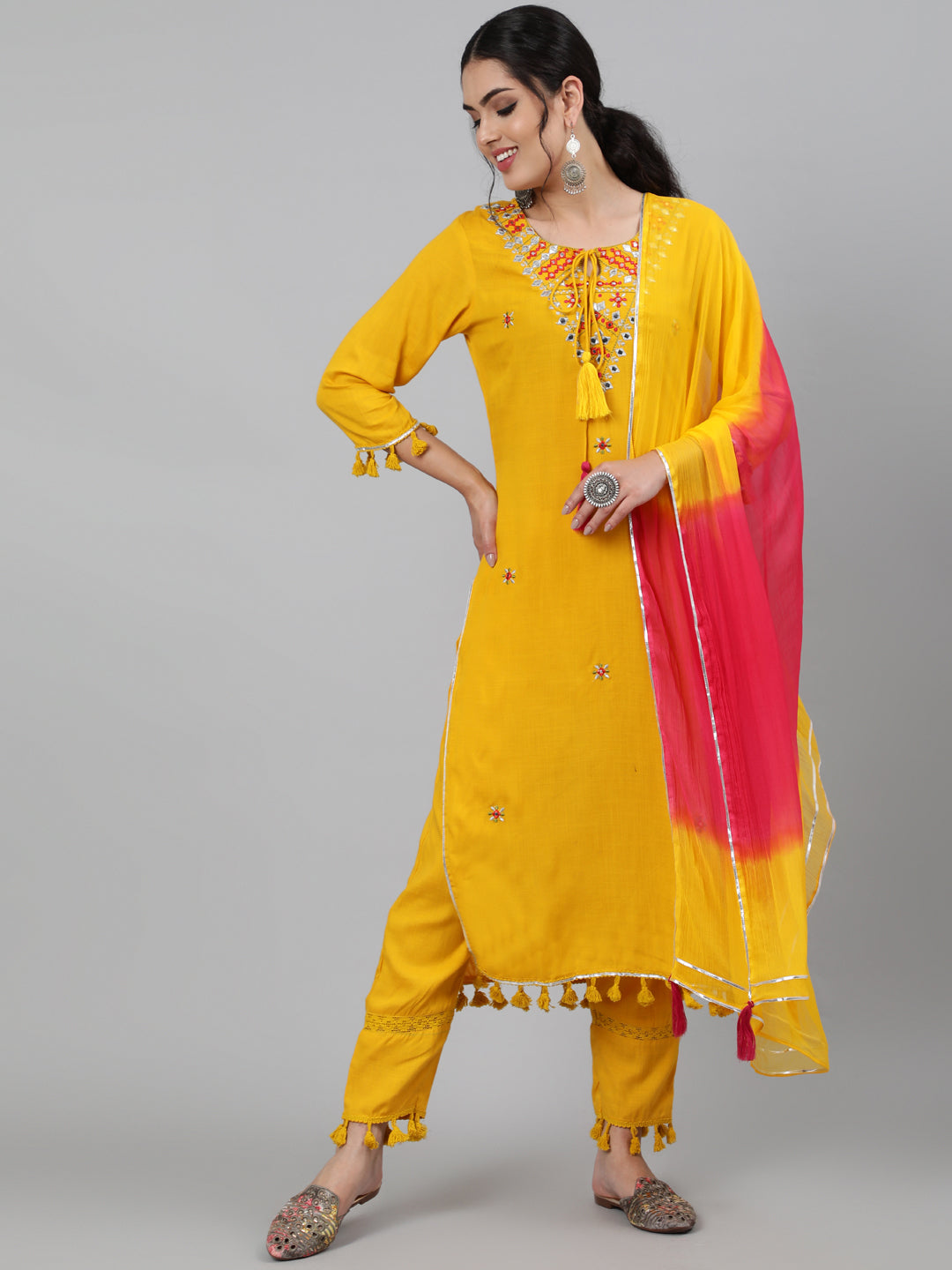 Women Rayon Slub Round Neck 3/4 Sleeve Embroidered Straight Kurta, Pant & Chiffon Tie-Dye Dupatta Set