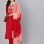 Rayon Slub Embroidered Straight 3/4 Sleeve Round Neck Calf Length Kurta Set (Preorder)