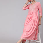 Rayon Calf Length Embroidered Flared 3/4 Sleeve Round Neck Kurta Set (Preorder)