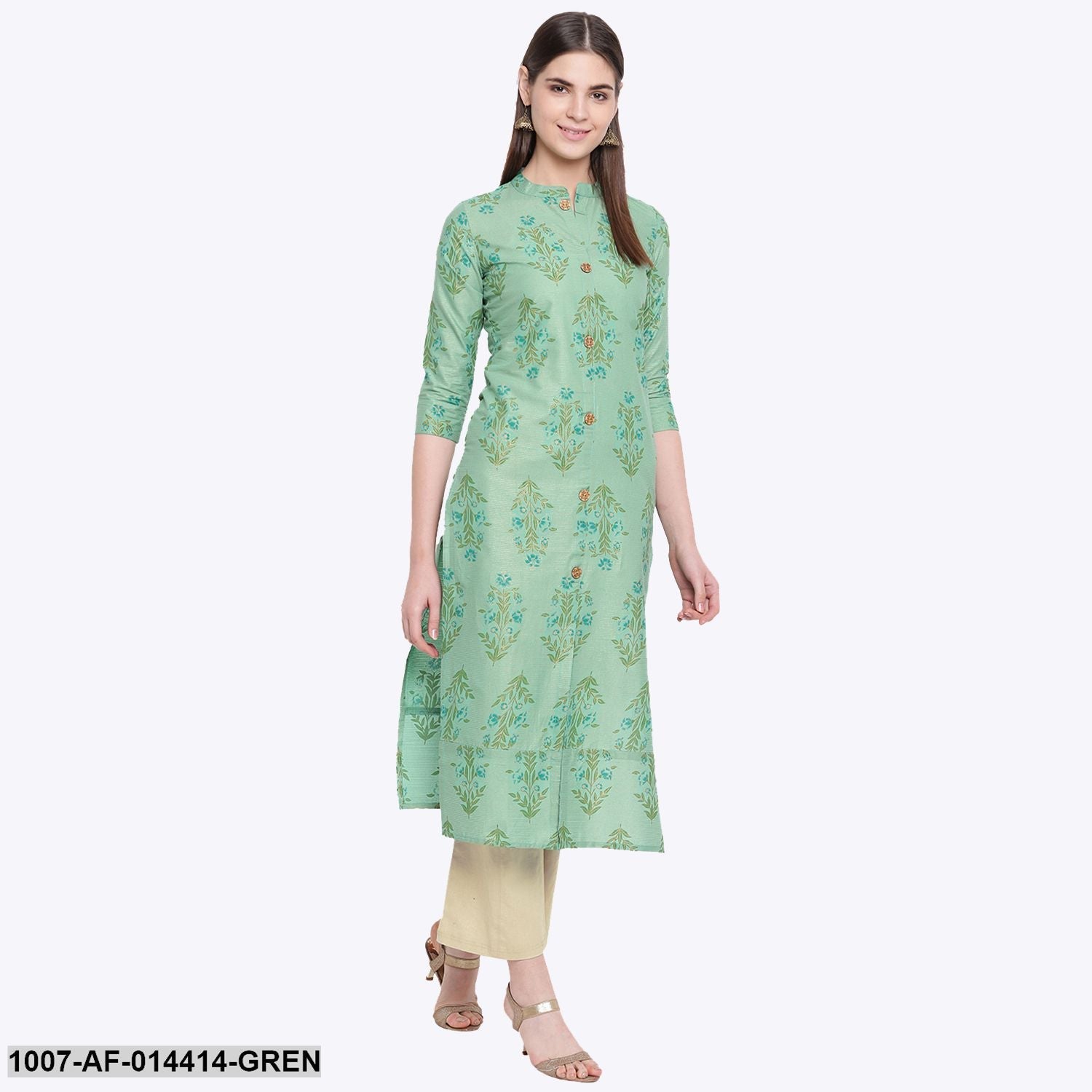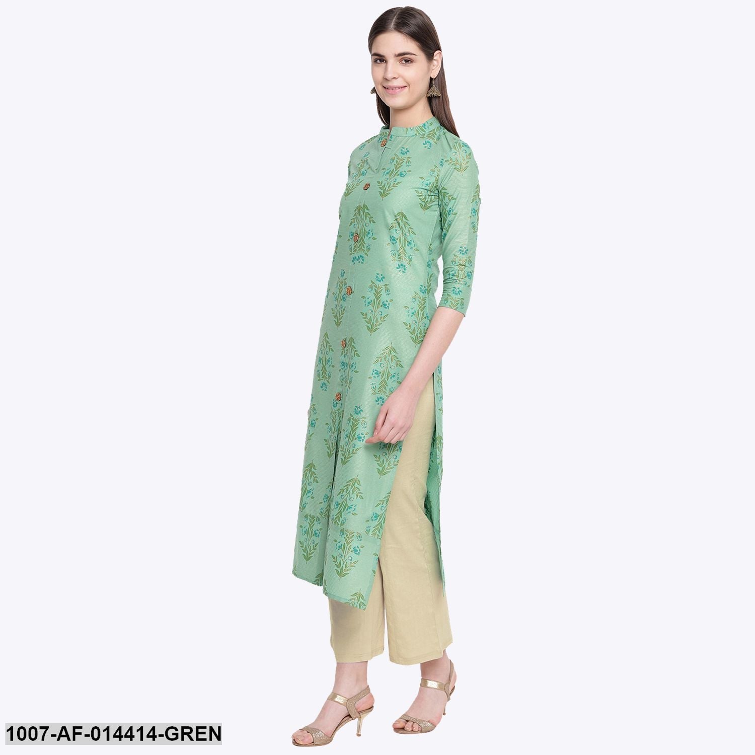 Floral Print Cotton Straight Kurta Pant Set (Green,Beige) (Pre-Order)