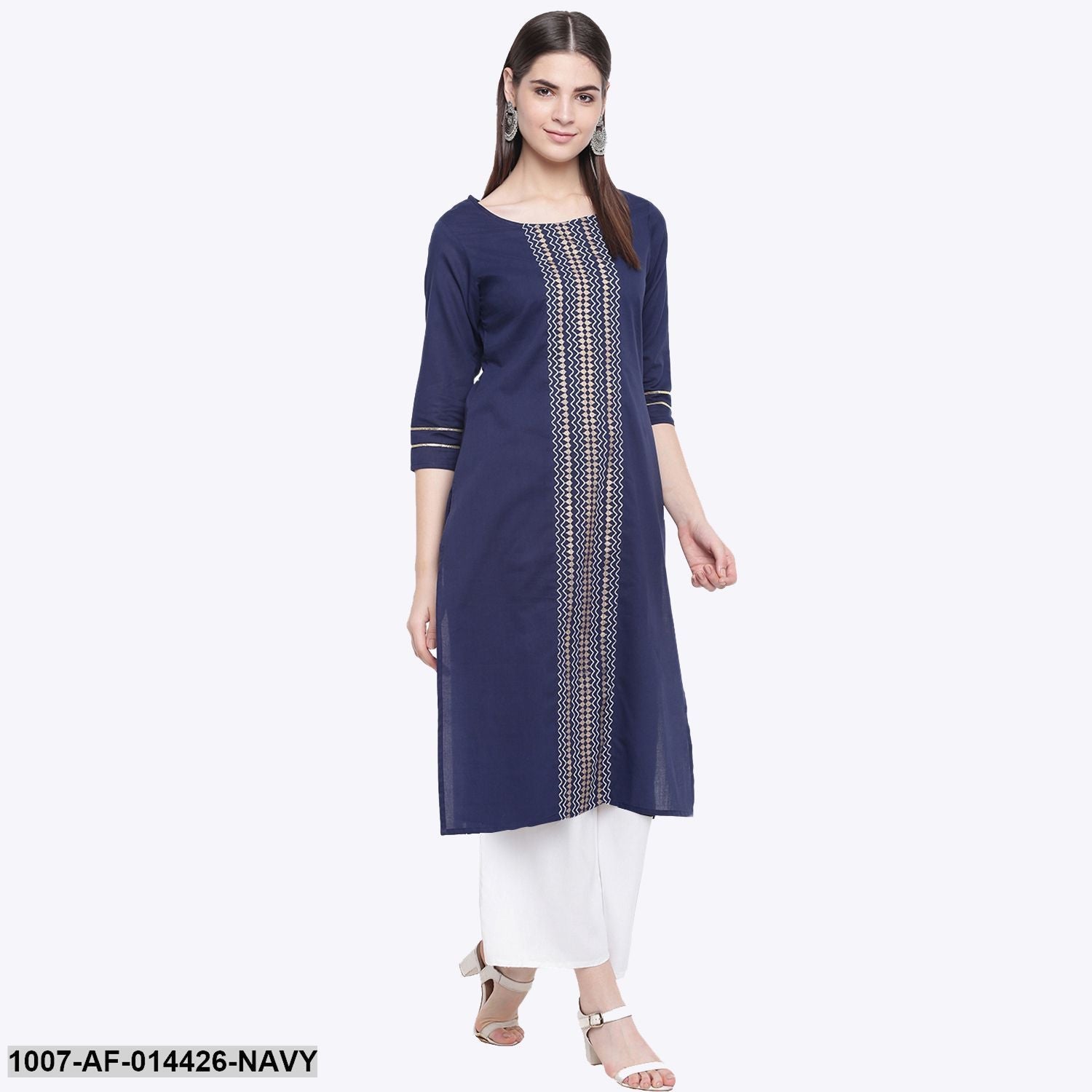 Gold Print Cotton Straight Kurta Palazzo Set (Navy Blue,White) (Pre-Order)