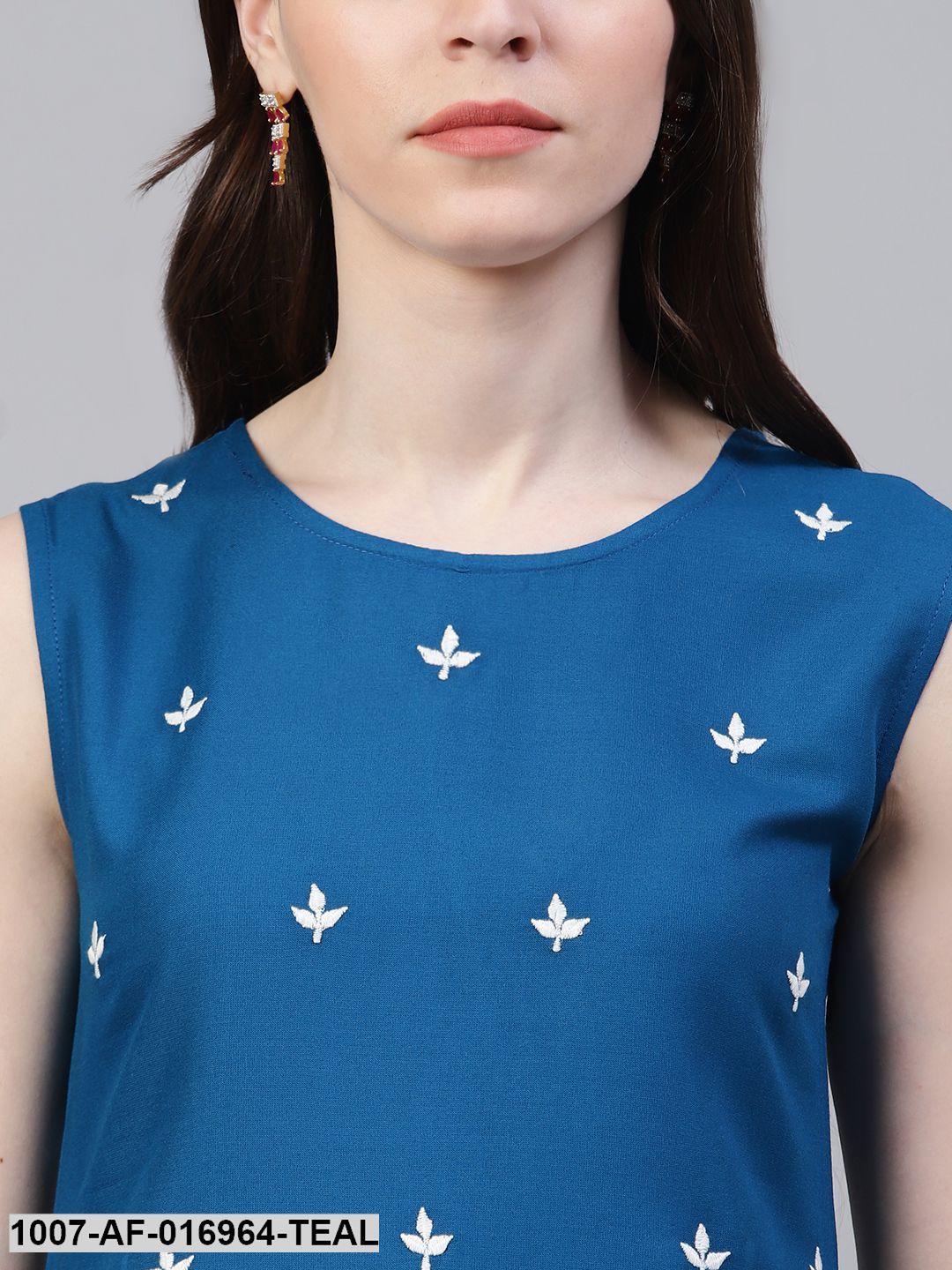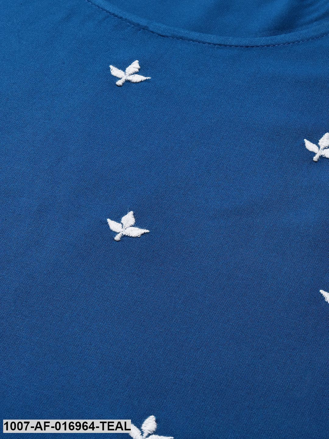 Embroidered Rayon Straight Kurta Skirt Dupatta Set (Teal Blue) (Pre-Order)