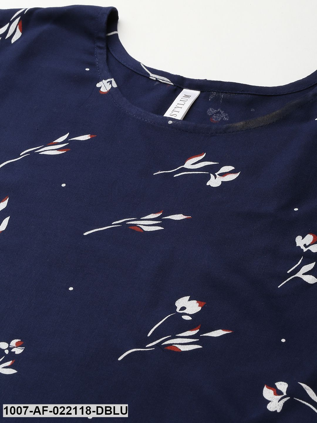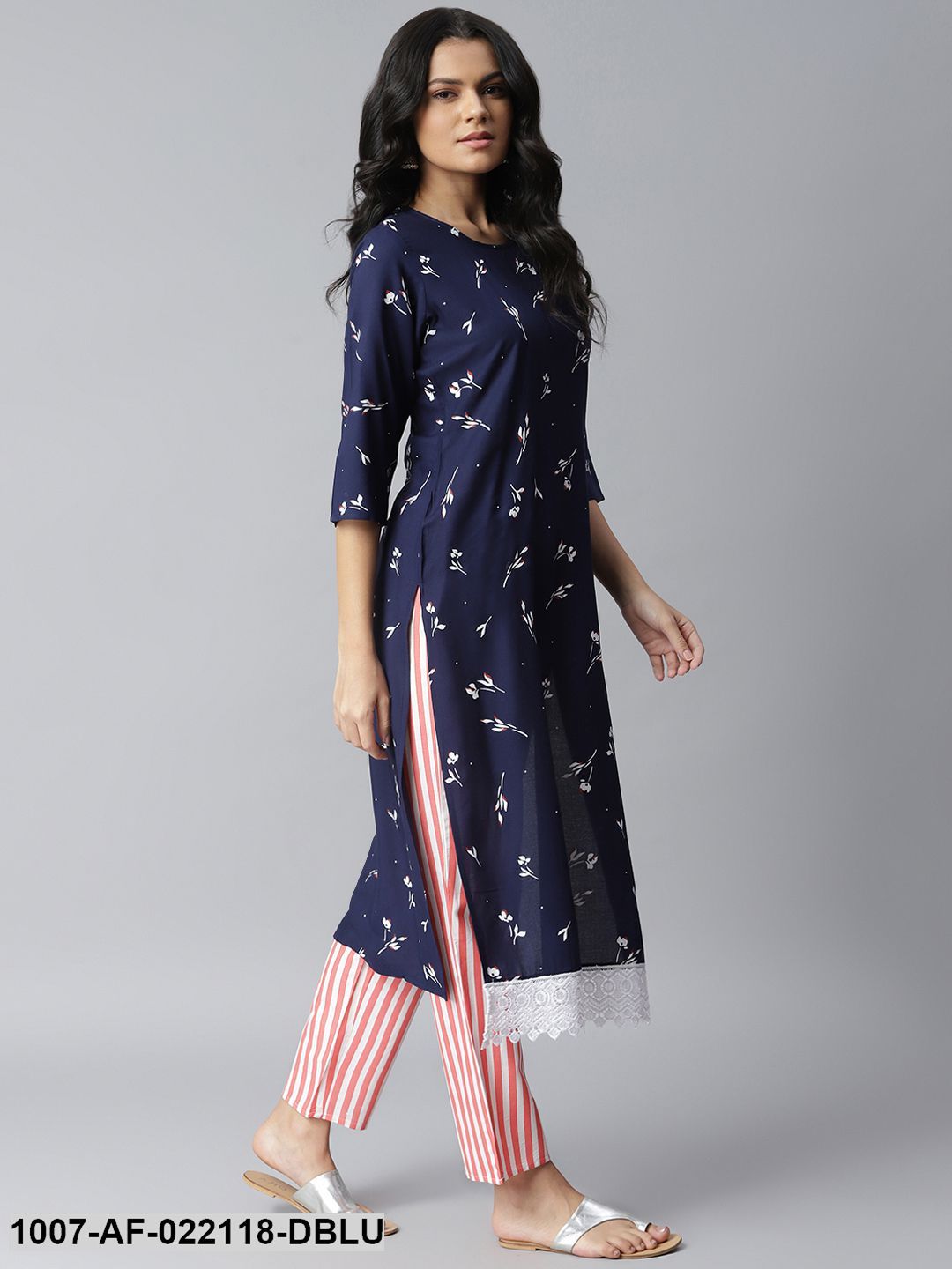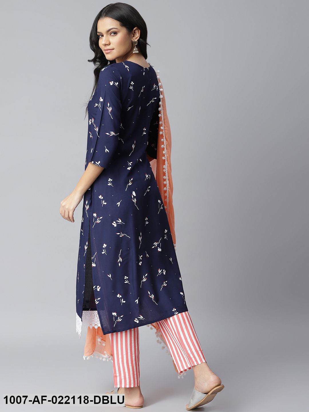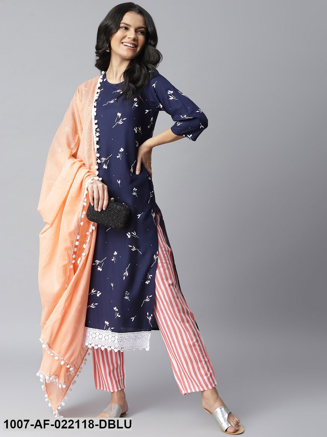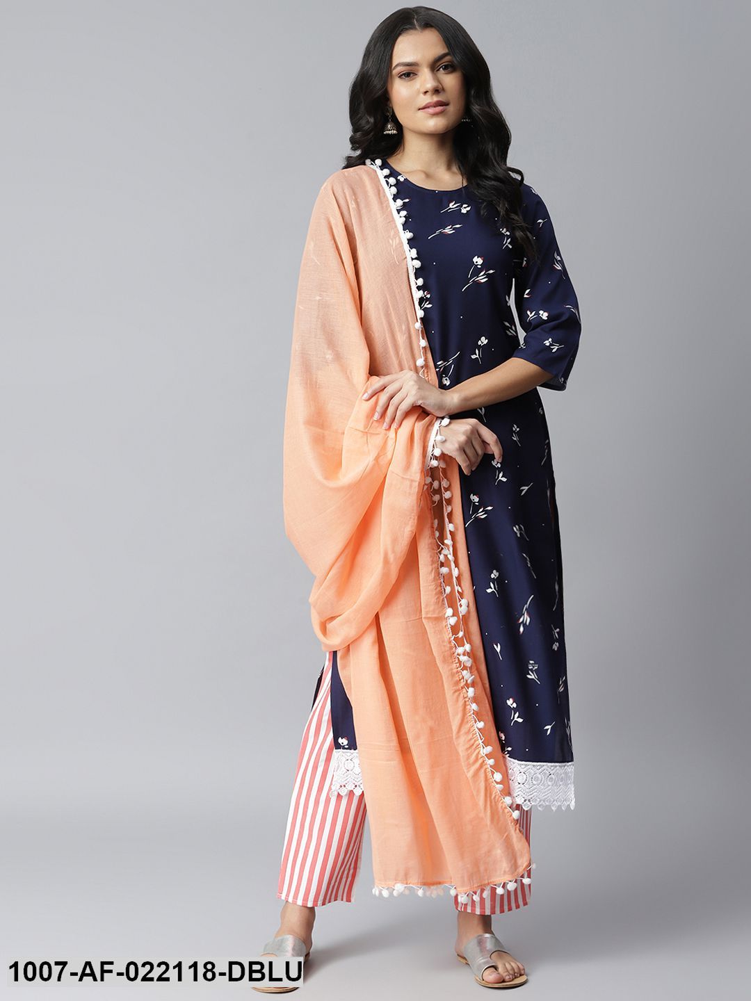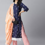 Women's Printed Rayon Straight Kurta Pant Dupatta Set (Navy Blue, Peach) (Pre-Order)