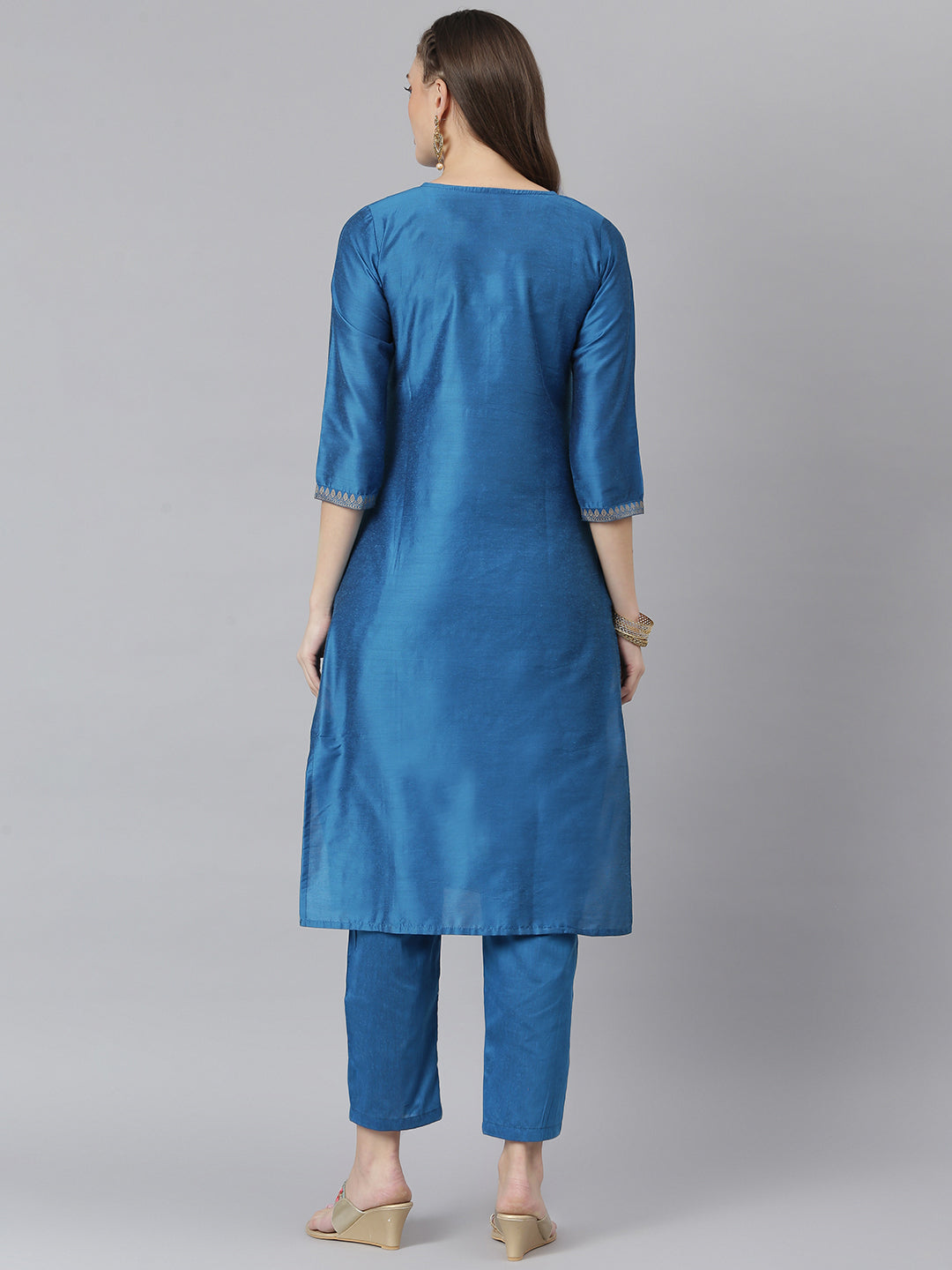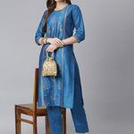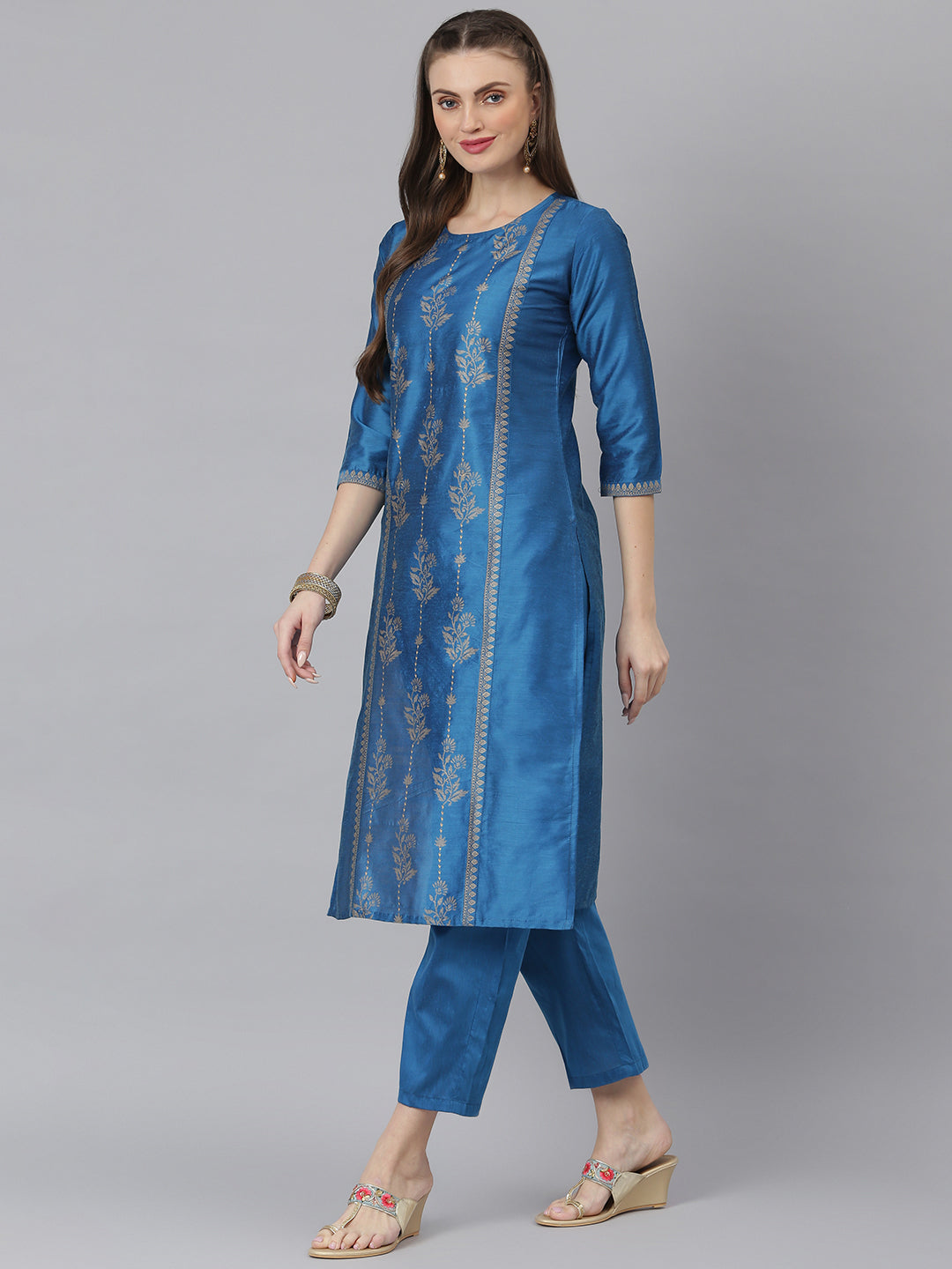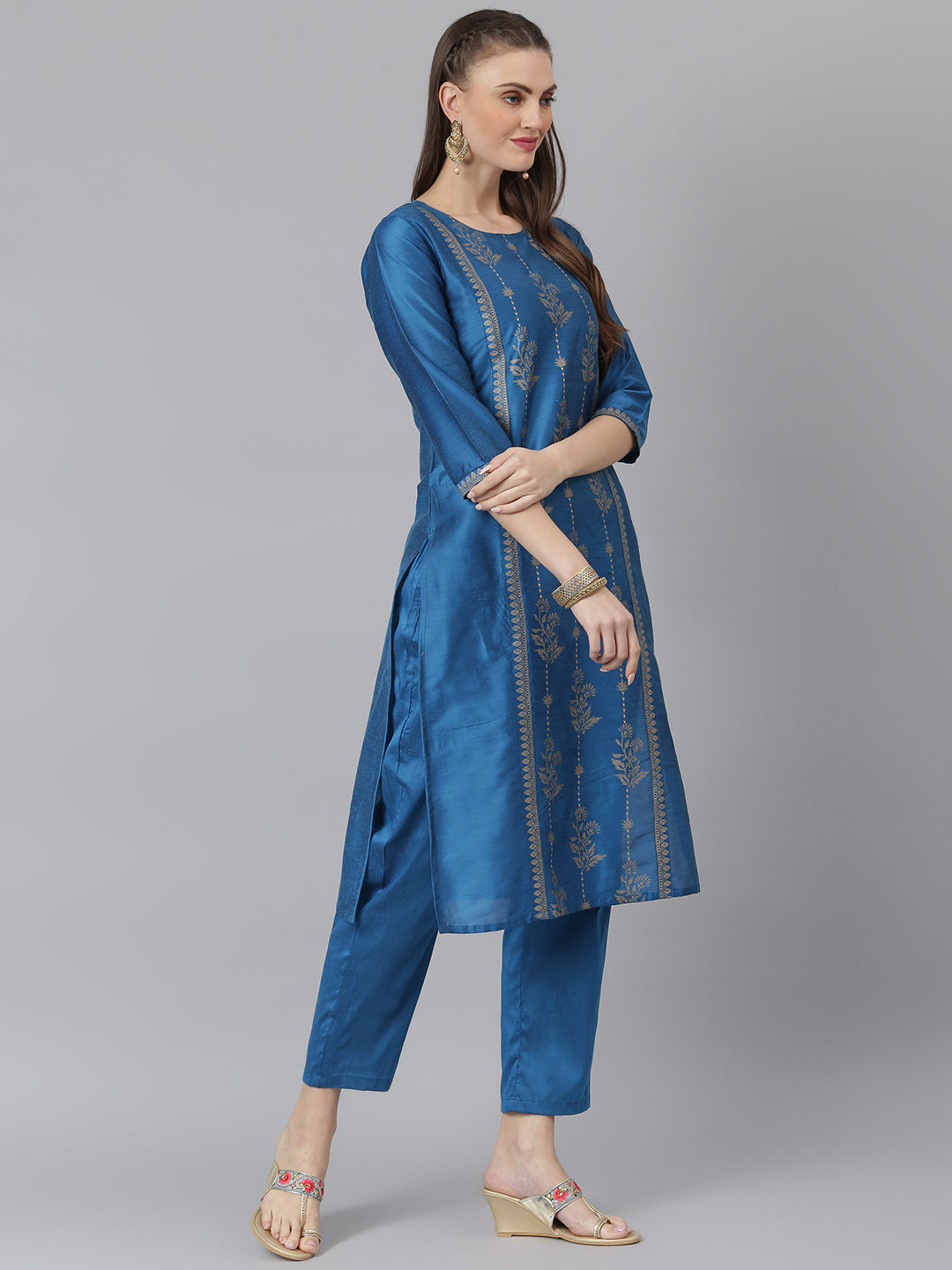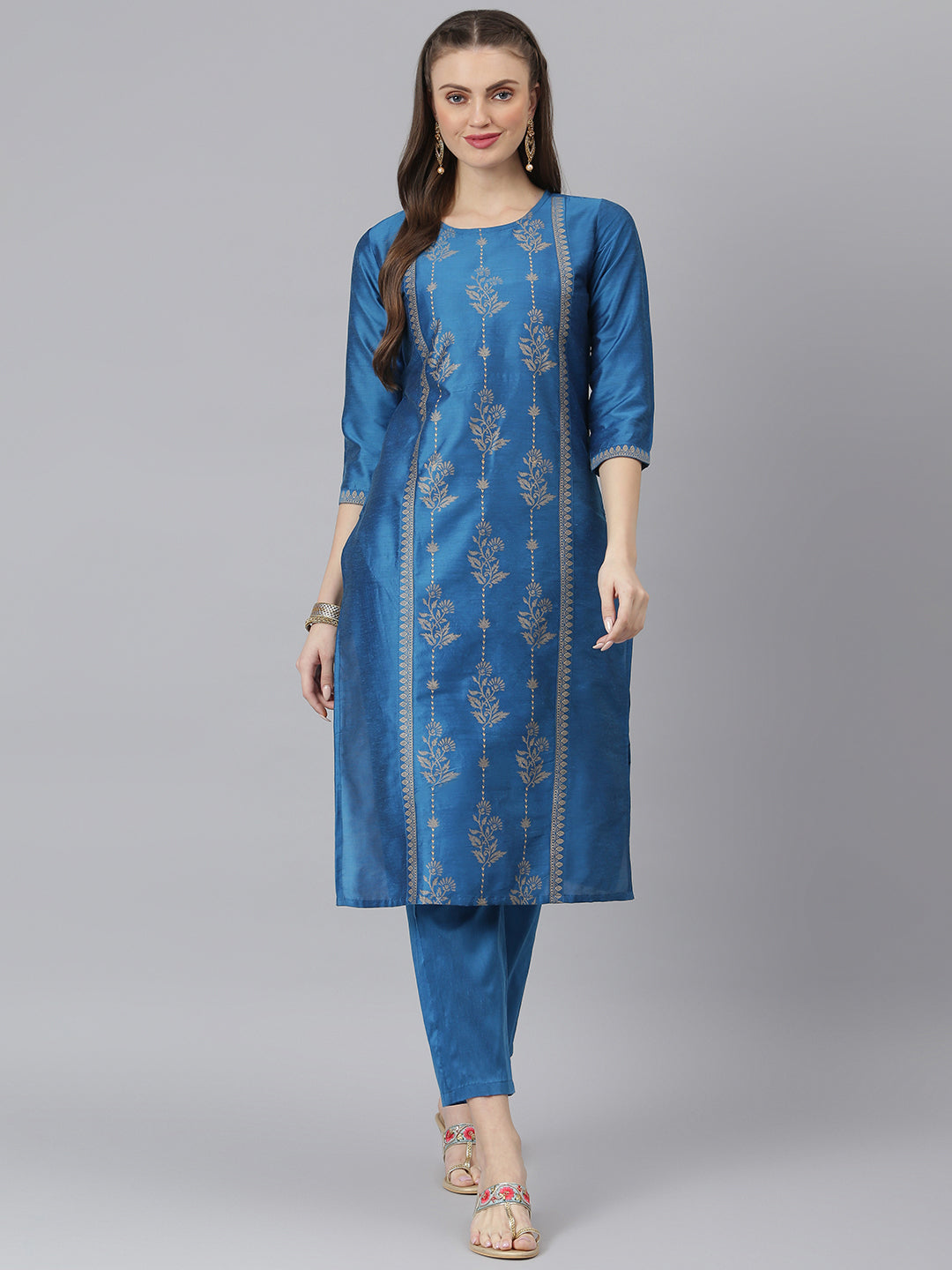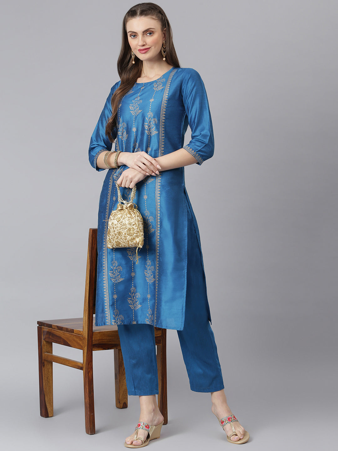 Women Gold Printed Poly Silk Straight Kurta Pant Set (Pre-Order)