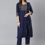 Women Gold Printed Rayon Straight Kurta Pant Dupatta Set (Pre-Order)
