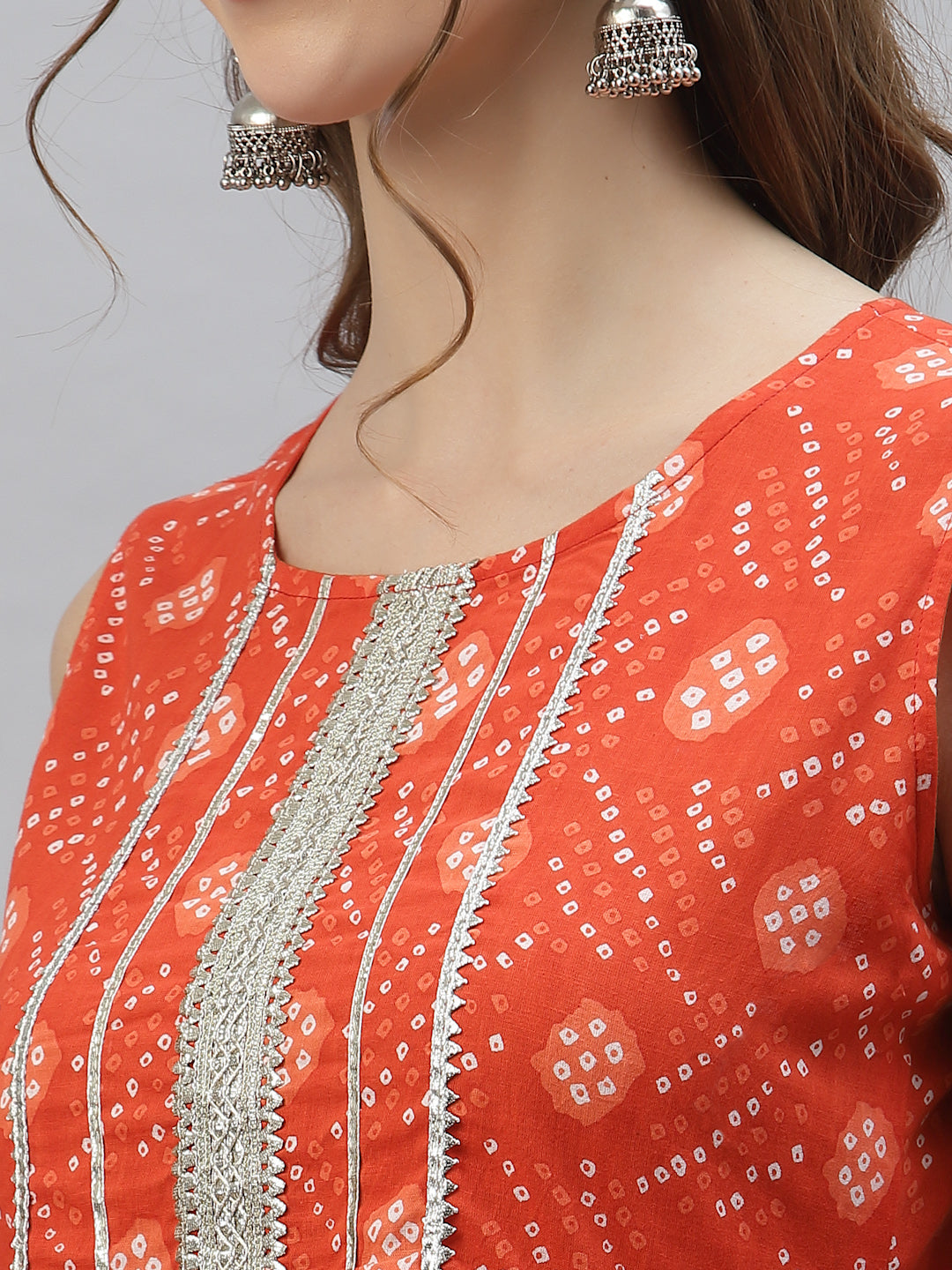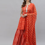 Bandhej printed Cotton Flared short Kurta Sharara Dupatta Set (Pre-Order)