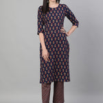 Navy Blue & Orange Printed Kurta with Trousers