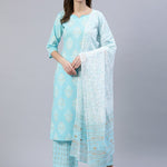 Blue & Gold Printed Straight Kurta With Trouser & Dupatta