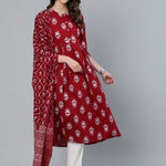 Maroon & White Printed A-Line Round Neck Pure Cotton Kurta Set