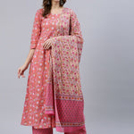 Pink & Orange Floral Screen Print A-Line Pure Cotton Kurta Set With Dupatta