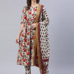 Off White & Red Floral Screen Print A-Line Pure Cotton Kurta Set With Dupatta