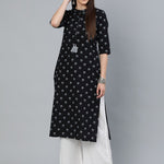 Black Floral Printed Straight Three-Quarter Sleeved Kurta
