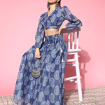 Women Blue Paisley Wrap Crop Top With Anarkali Skirt