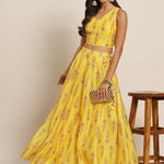 Women Yellow Chanderi Floral Crop Top With Anarkali Skirt