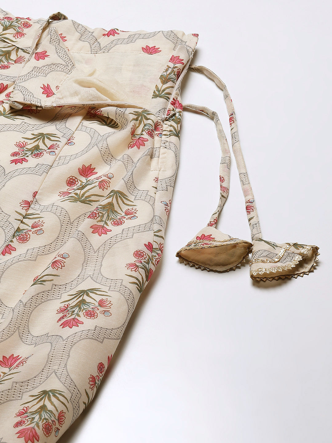Beige Mughal Floral Crop Top With Anarkali Skirt, in Chanderi Poly Silk fabric, Cotton Lining, Crop Length / Full Length, Slim Fit / Fit & Flare, Zipper Closure, Straight / Flared Hemline and features Kinari Gota At Hem All Round