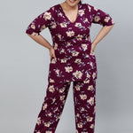 Plus Size Women Burgundy Floral Printed Night Suit With Half Sleeves