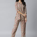 Women's Floral Printed Cotton Night Suit Set (Beige) (Pre-Order)