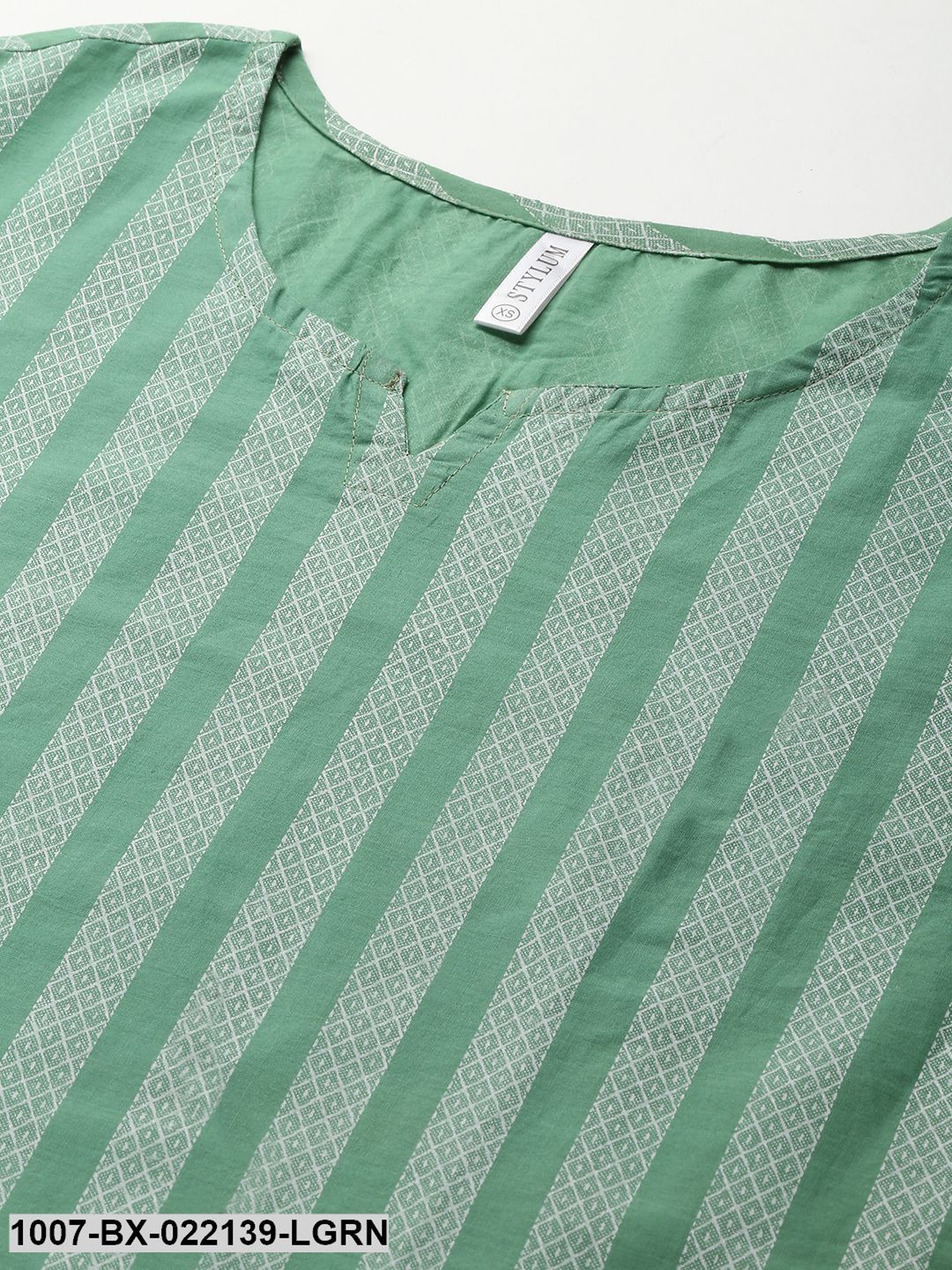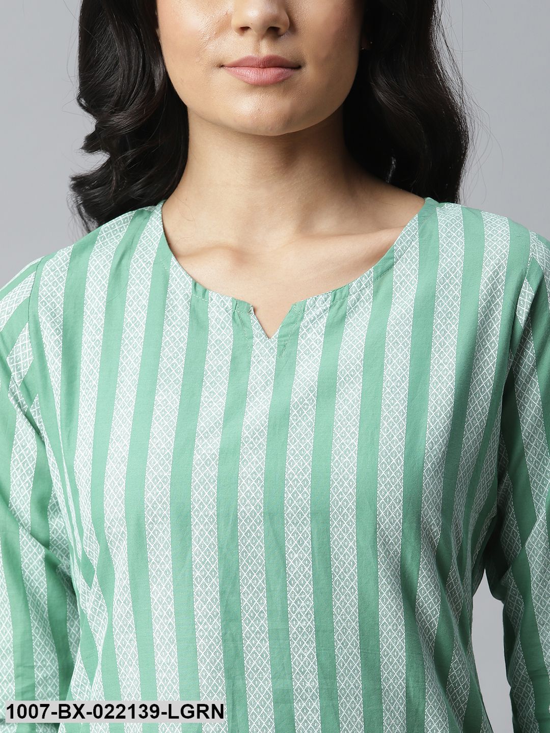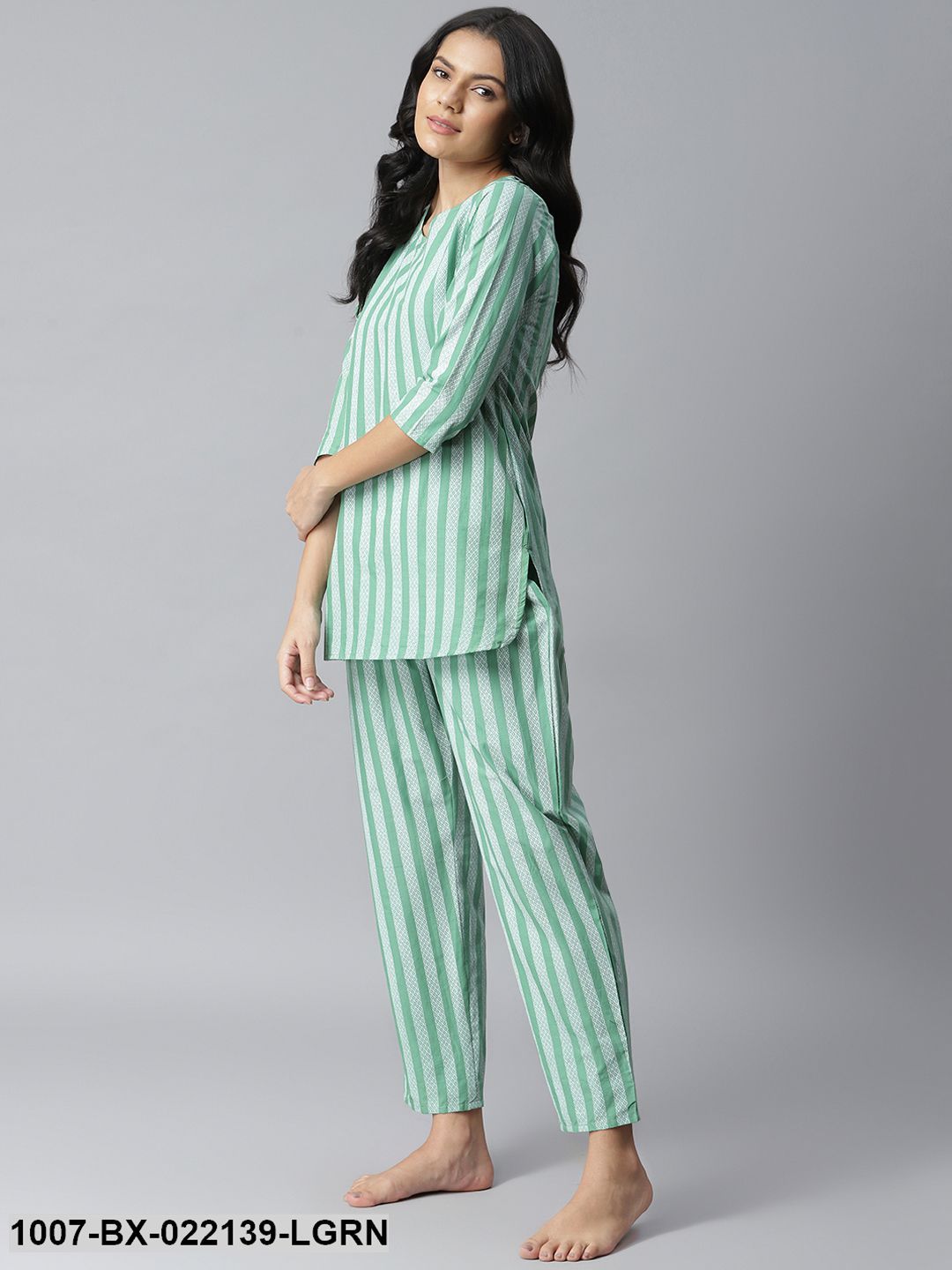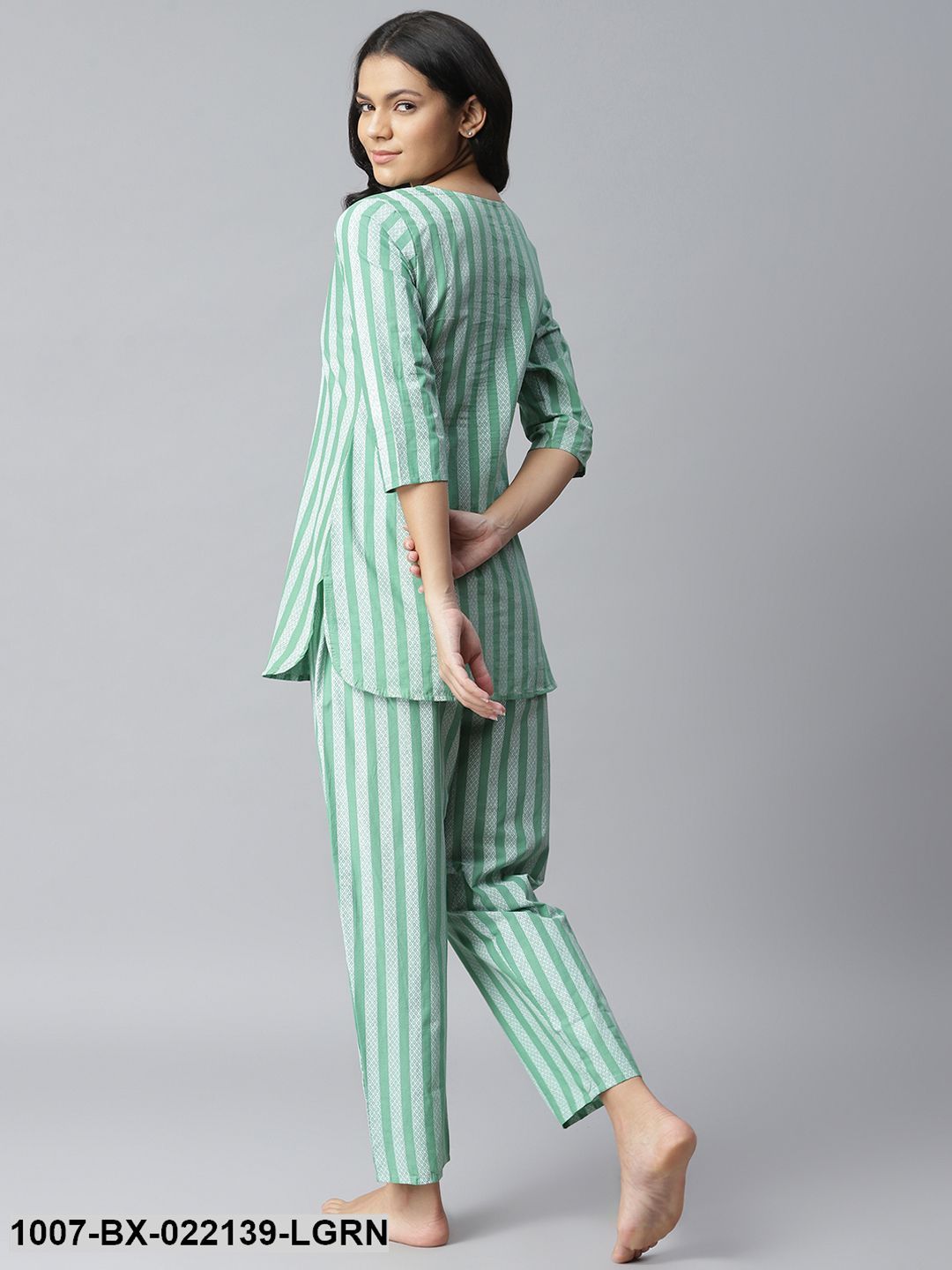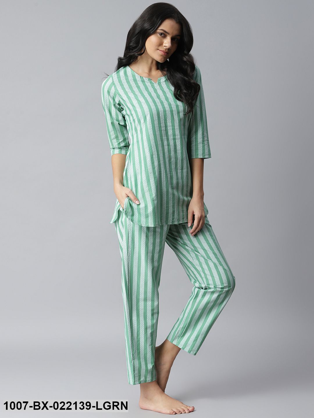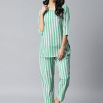 Women's Striped Cotton Night Suit Set (Light Green) (Pre-Order)