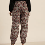 Chocolate Brown Floral Cuffed Pants, in Cotton Flex fabric, Cotton Lining, Ankle Length, Comfort Fit, No Closure, Straight Hemline and features Elastic At Hem Cuff