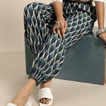 Navy Ikat Cuff Hem Pants, in Cotton Flex fabric, Cotton Lining, Ankle Length, Comfort Fit, No Closure, Straight Hemline and features Elastic At Hem Cuff