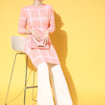Pink & White Check Hair Wool Long Sweater, in Naylon fabric, Unlined, Knee Length, Comfort Fit, No Closure, Straight Hemline and features Placement Knitted Sweaters