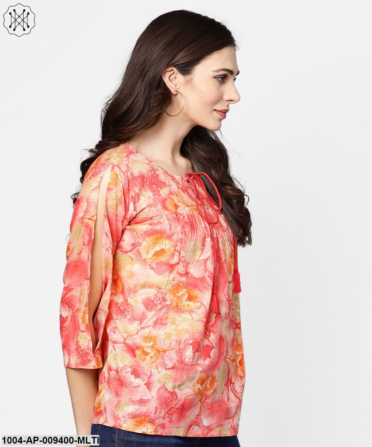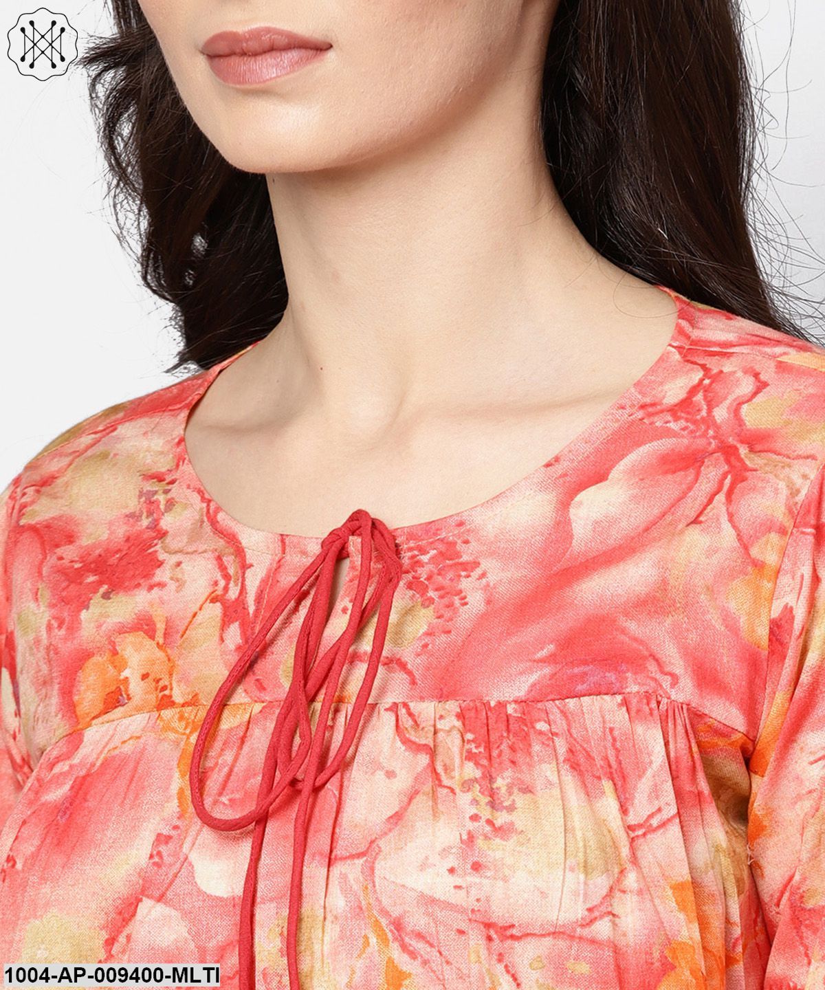 Red & Beige Top With Keyhole Neckline & 3/4 Sleeves