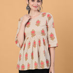 Printed Flared Short Length 3/4 Sleeve Round Neck Cotton Top
