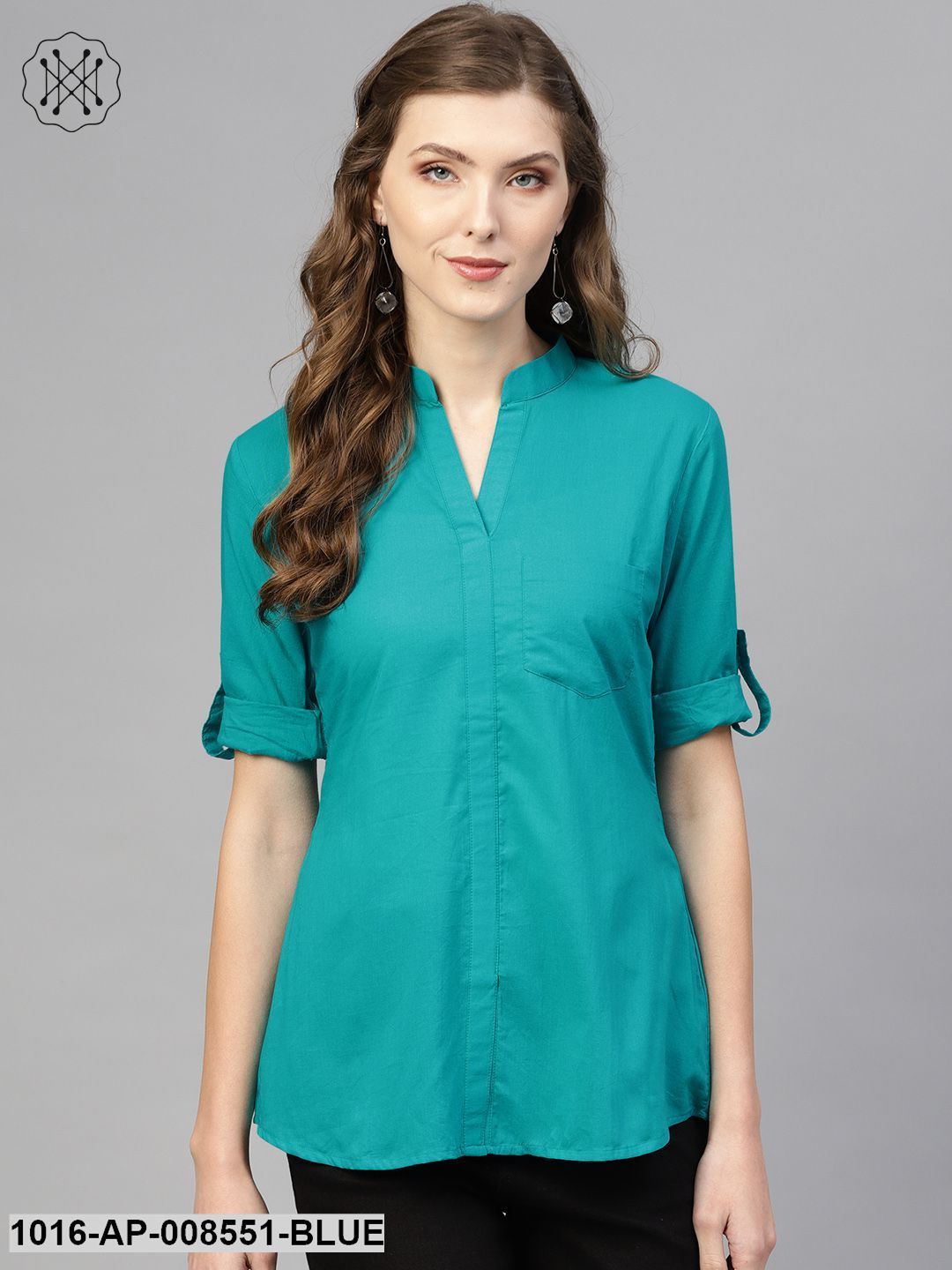 Turquoise Blue Top With Mandarin Collar & 3/4 Sleeves