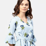 Blue Striped 3/4Th Sleeve Crepe Peplum Style Top With Attached Belt