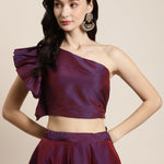 Purple One Shoulder Crop Top, in Taffeta fabric, Cotton Lining, Crop Length, Slim Fit, Zipper Closure, Straight Hemline and features Frill On One Shoulder