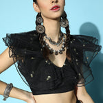 Black Tulle Sequin V Neck Crop Top, in Tulle fabric, Shantoon Lining, Crop Length, Slim Fit, Zipper Closure, Straight Hemline and features Frill Detail At Front Neck