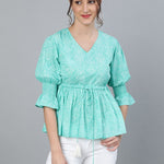 Green & White Printed Bell Sleeves Pure Cotton Cinched Waist Top