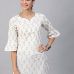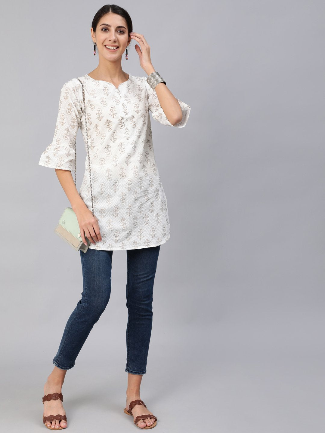 Women Off-White & Gold Printed Tunic With Three Quarter Sleeves