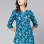 Blue Floral Printed Straight Tunic With Three Quarter Sleeves