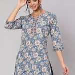 Blue & Pink Floral Printed Straight Tunic With Three Quarter Sleeves
