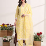 Yellow Floral Lace Work Straight Kurta Pant Dupatta Set