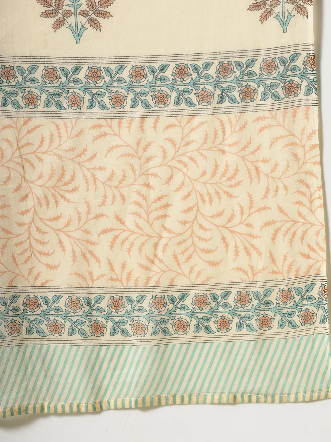 Beige, green and pink printed kurta with trousers and dupatta