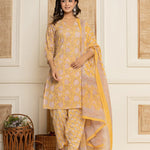 Yellow Floral Print Cotton Straight Style Kurta And Dhoti Pants With Dupatta Set