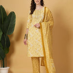 Yellow Floral Print Thread-Work Straight Kurta Trouser Dupatta Set