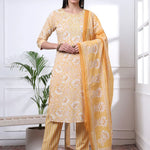 Yellow Floral Print Thread Work Straight Kurta Trouser Dupatta Set