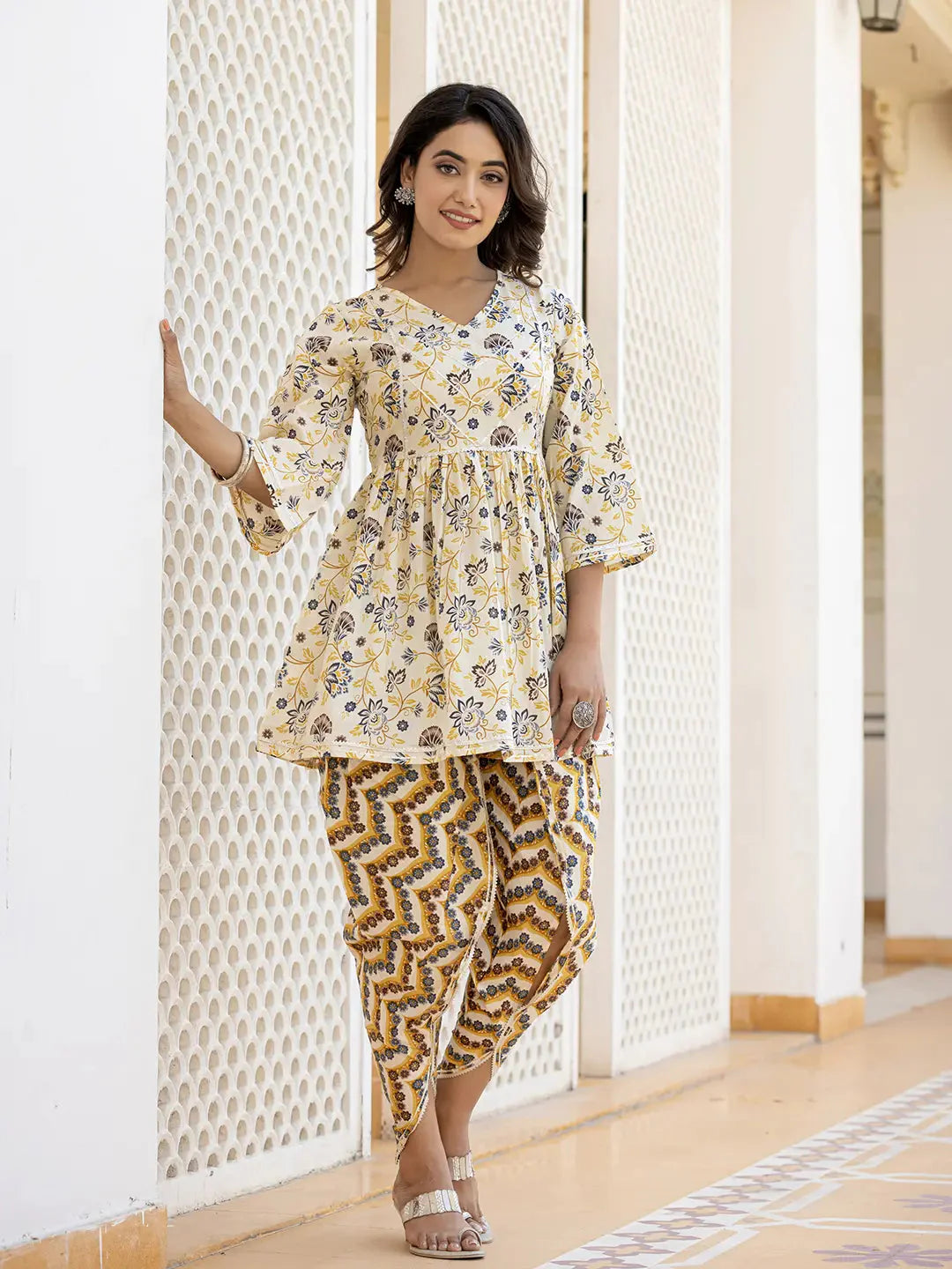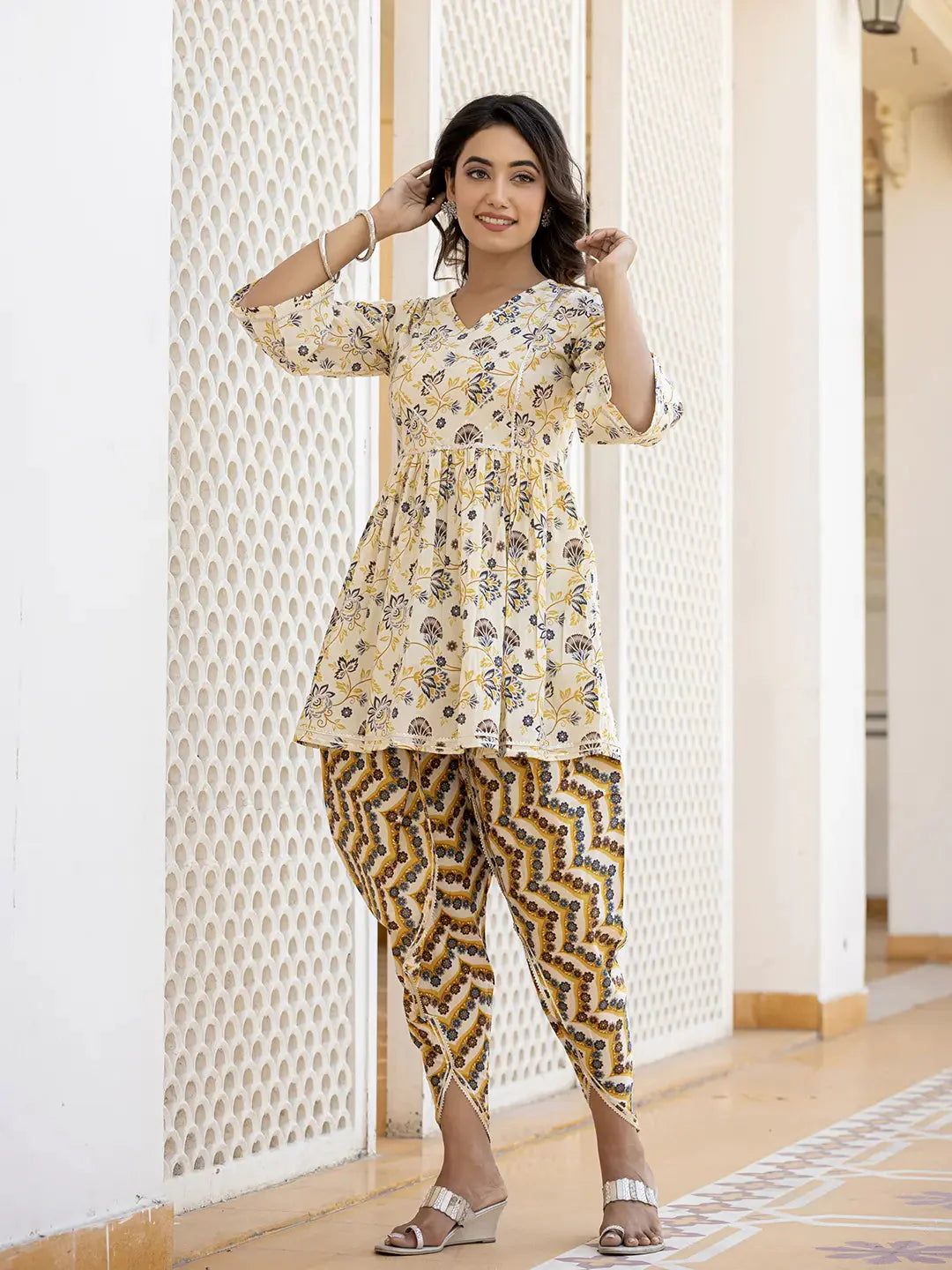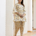 Yellow-coloured printed kuti with Dhoti Pants