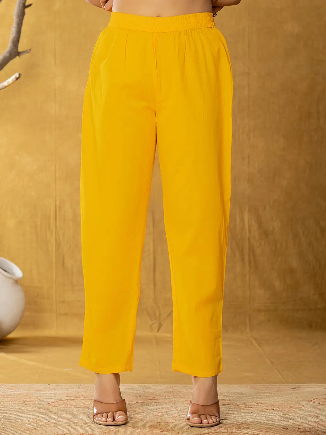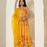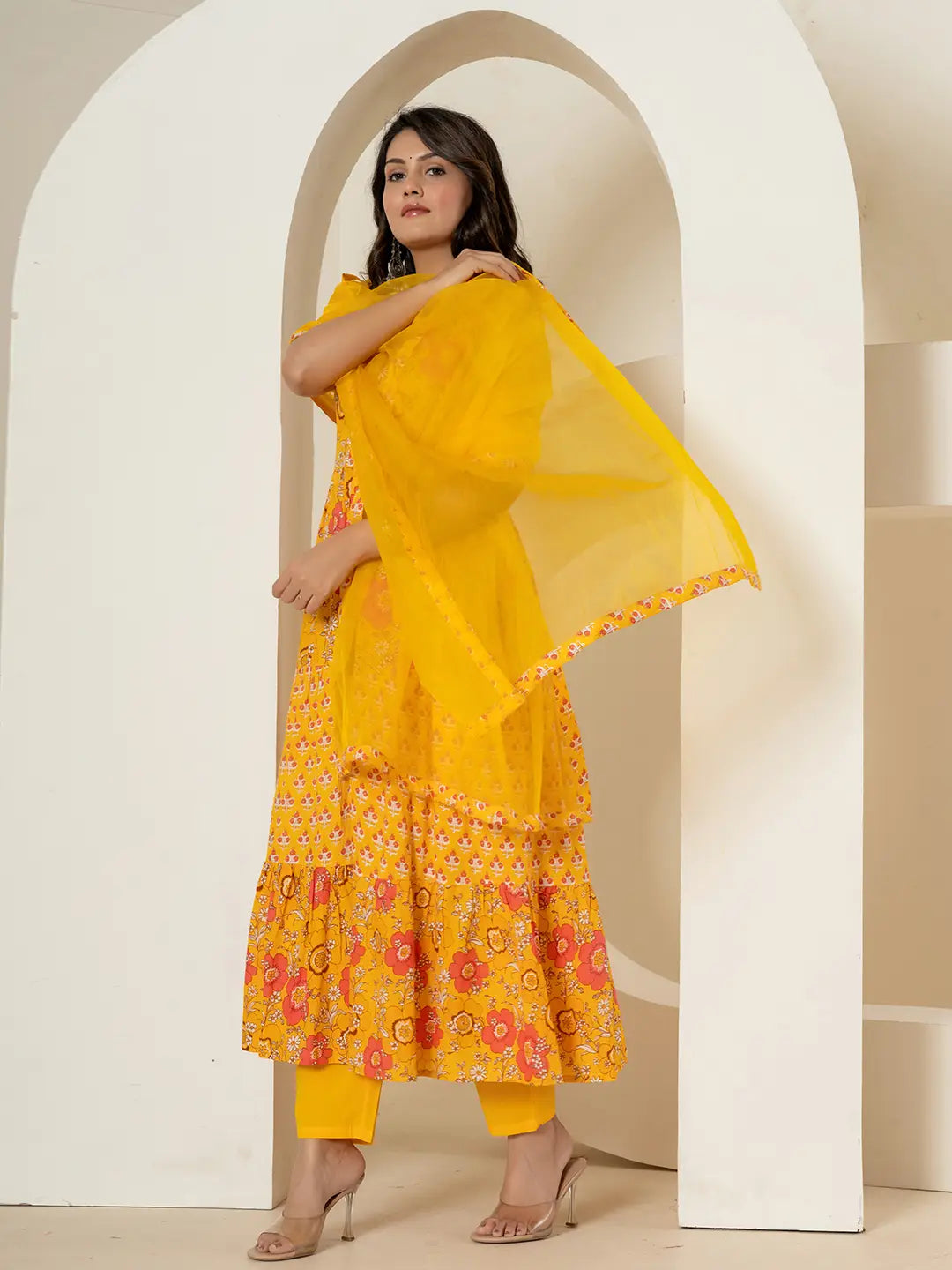Yellow Pure Cotton Fit And Flare Tiered Kurta Trouser & Dupatta Set