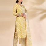 Yellow Pure Cotton Floral Lace Work Kurta Dupatta Pant Set