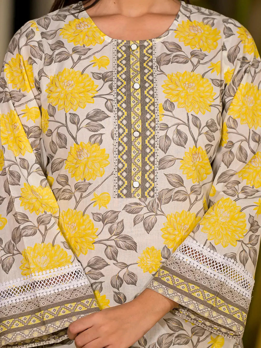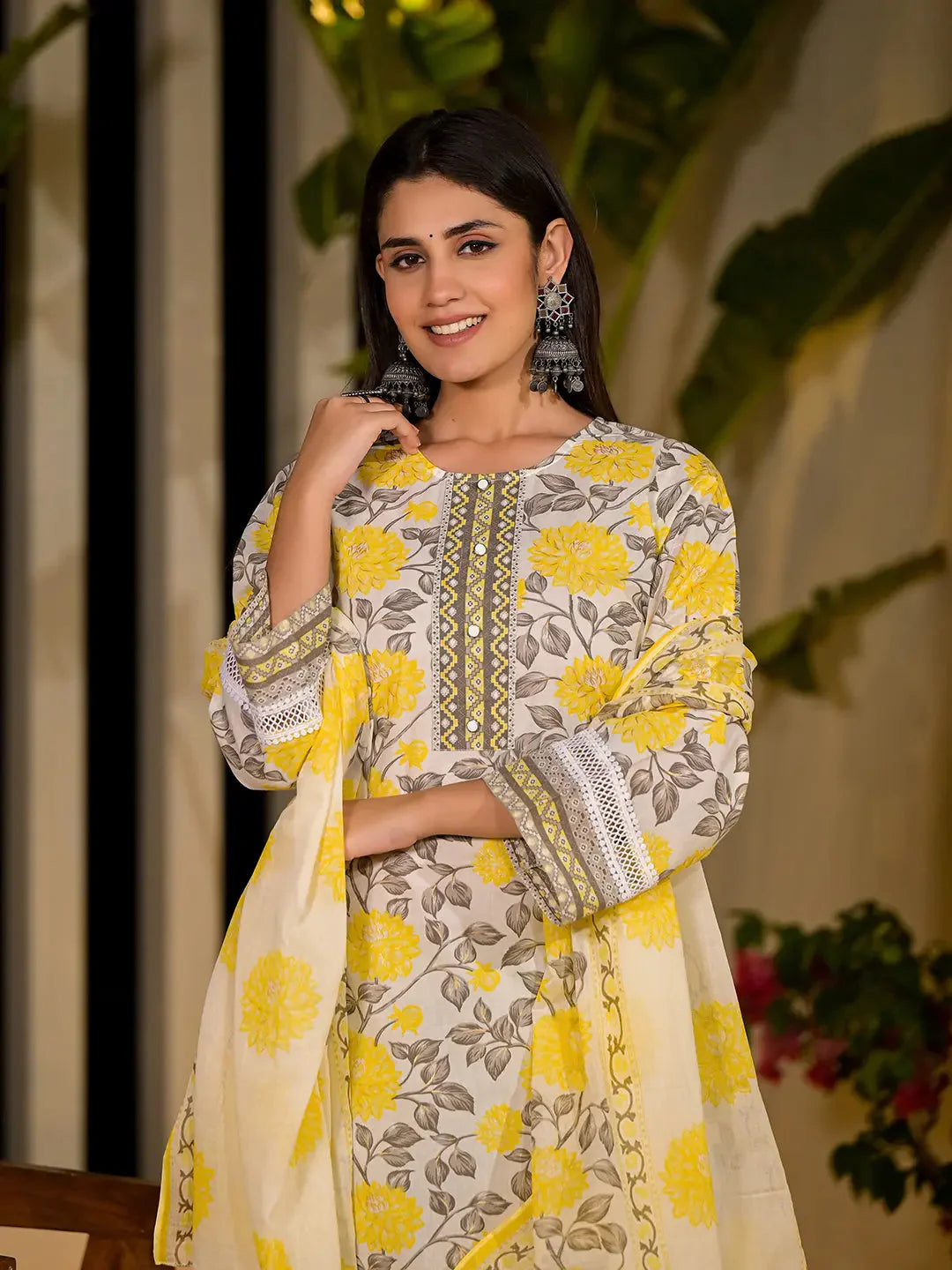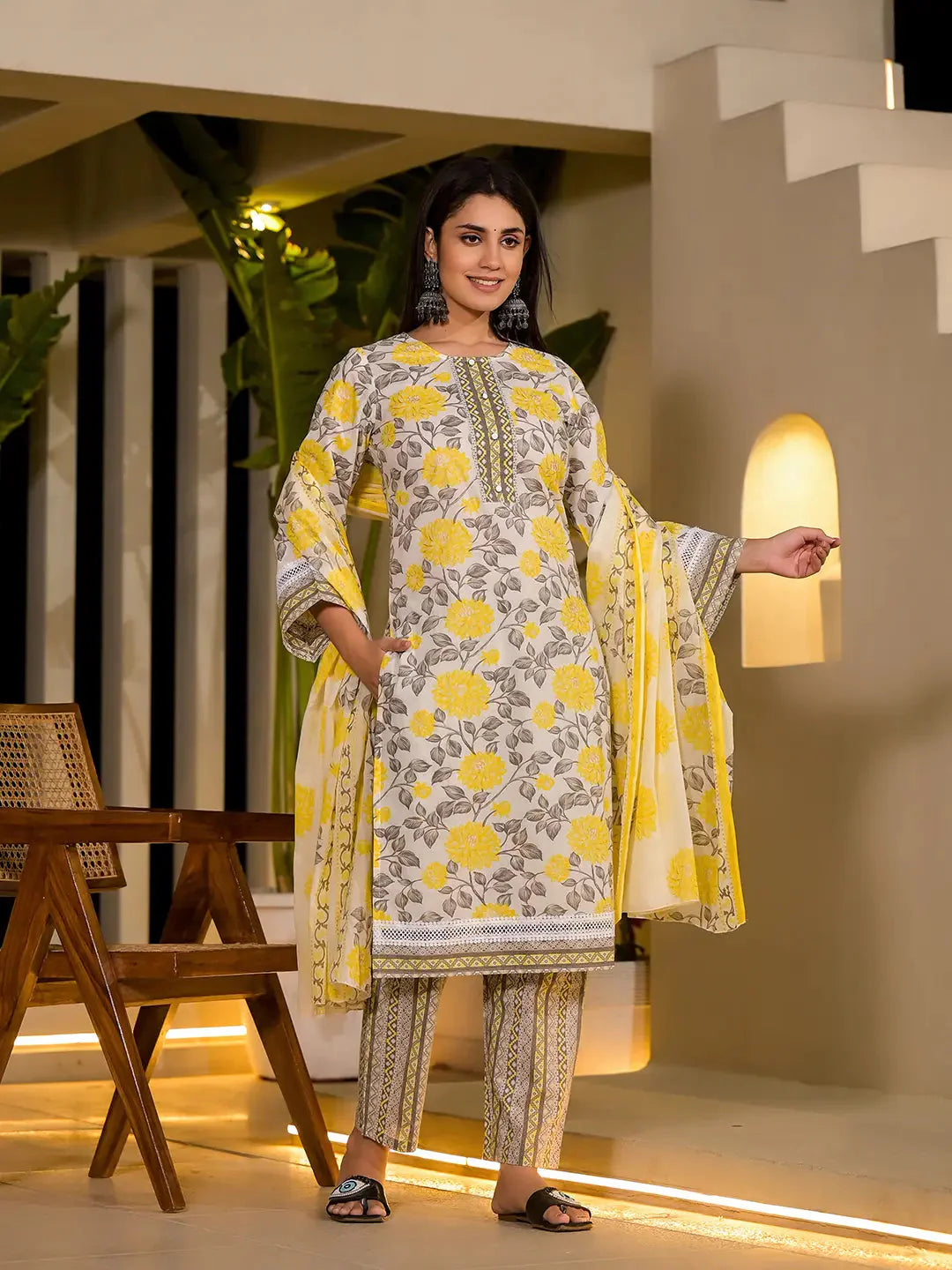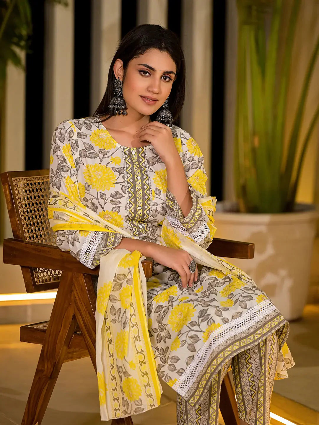 Yellow Pure Cotton Floral Print Kurta With Trousers And Dupatta Set